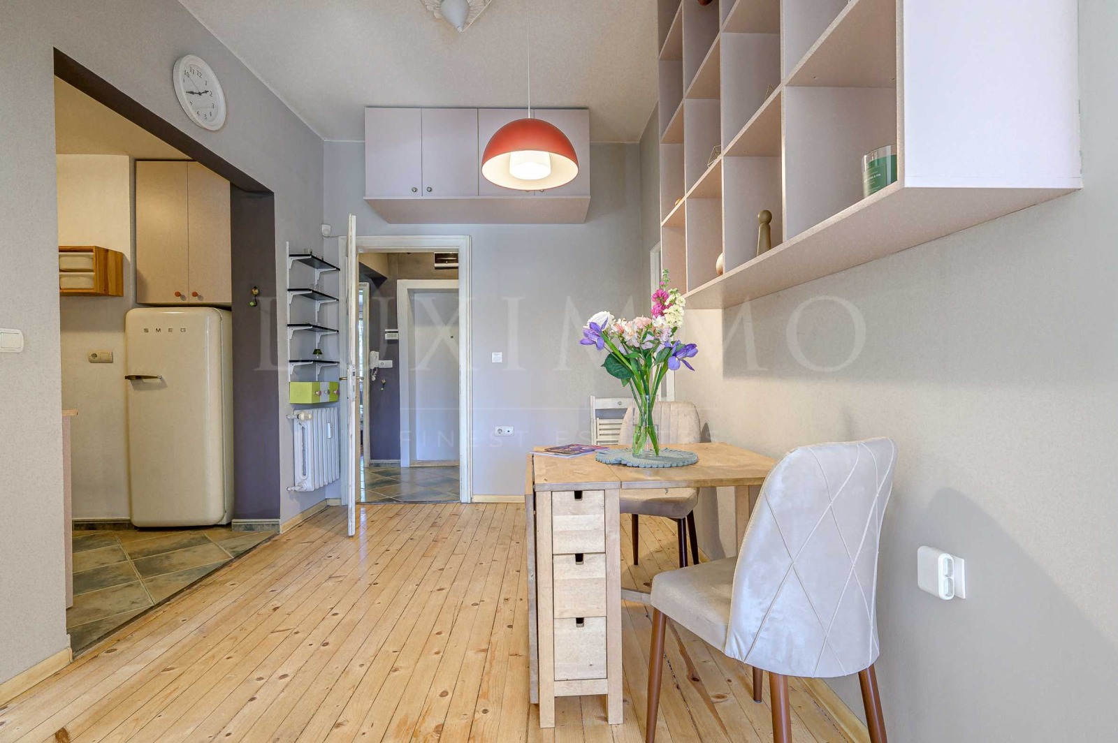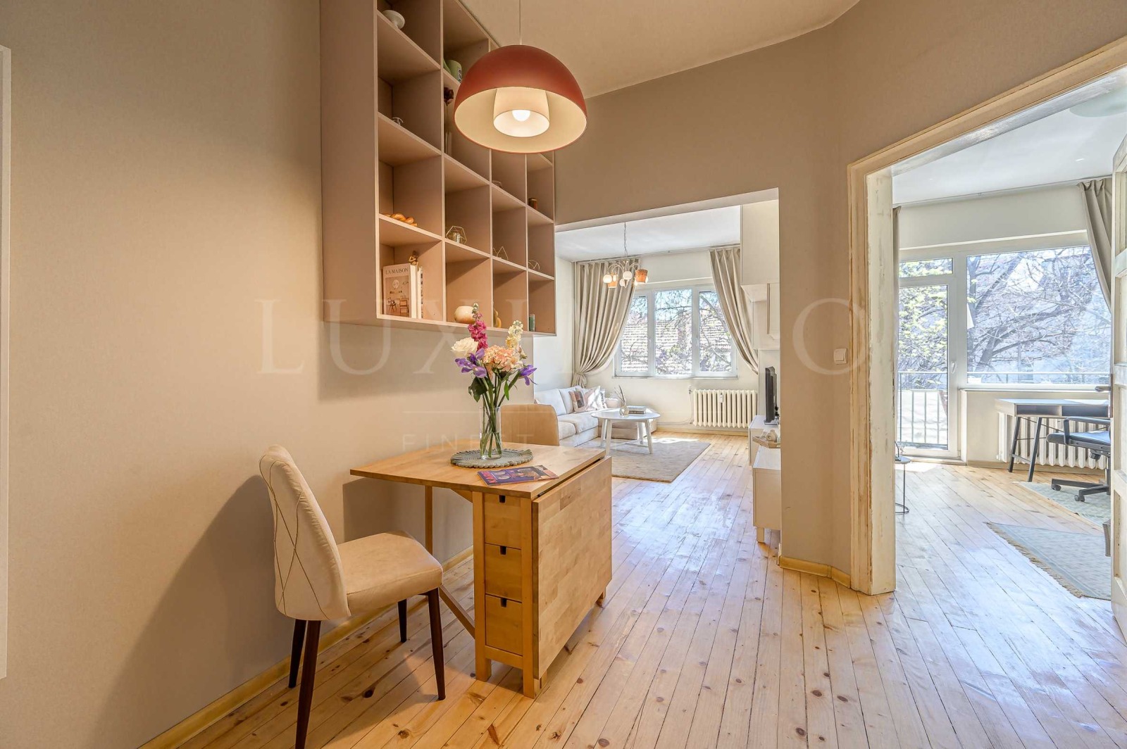 Жилището е с великолепна атмосфера. Всеки детайл, високите тавани, естественият паркет и запазените дървени врати му придават характер и уют. Светъл и просторен апартамент с усещане на истински дом .