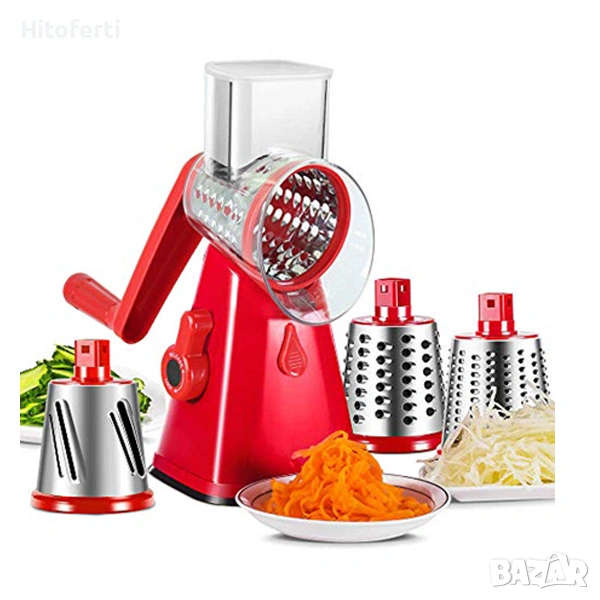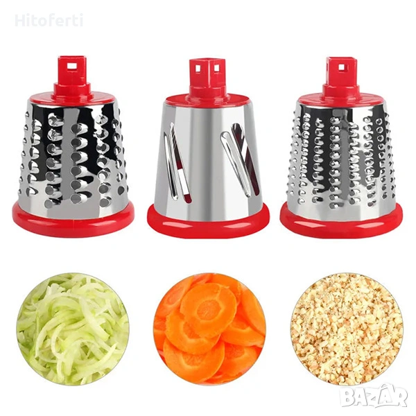 - Нашата ротационна ренде за сирене с 3 различни барабана от неръждаема стомана може да отговори на вашите различни нужди. Тя включва нож за рязане, нож за едро настъргване и нож за фино настъргване.