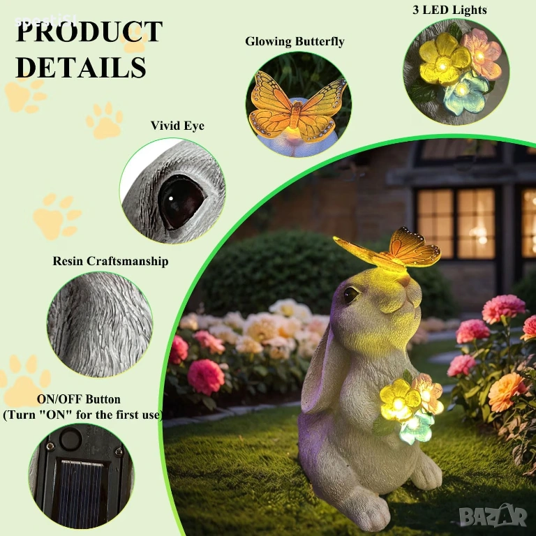 Автоматична: Вграденият сензор включва LED светлините (в пеперудата и цветята) автоматично при свечеряване.