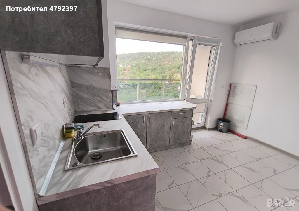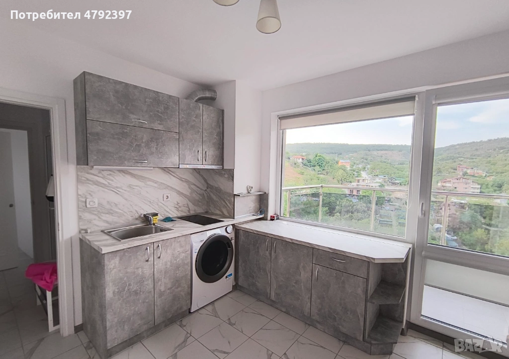 Напълно оборудвана кухня със стилни сиви шкафове в мраморен дизайн, индукционен плот, пералня и просторна работна площ. Големият прозорец осигурява светлина и пряка връзка с балкона.