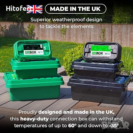 - ВОДЕЩА НА ПАЗАРА ЗАЩИТА ОТ ВЛАГОСЪСТОЯНИЕ: Средно черният DRiBOX е водещо на пазара решение за защита на външни електрически връзки. Проектиран във Великобритания и надежден в продължение на над 25 години, той е идеален за градинско осветление, електрически инструменти и празнични декорации. Сертифициран по CE за надеждна и безопасна употреба през цялата година.