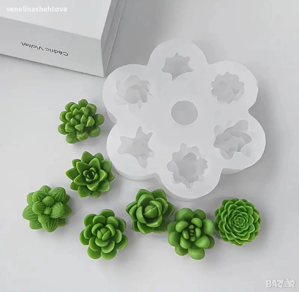 Нов силиконов молд със седем различни сукуленти, за изработка на свещи, гипс, сапун, смола, фондан за декорация на торта и др.