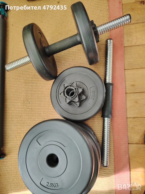 Комплект дъмбели-два държача по 1 кг, 4 диска по 2 кг, 4 диска по 2.5 кг и 4 накрайника. Използвани са две седмици.