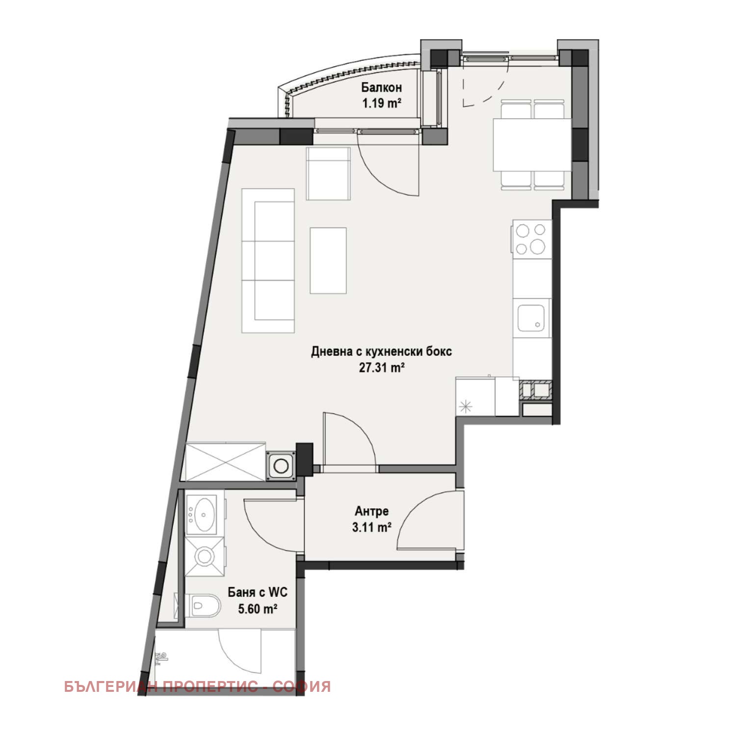 Апартамент 1 , обща площ 49.71 кв.м. (нетна площ 43.40 кв.м.).