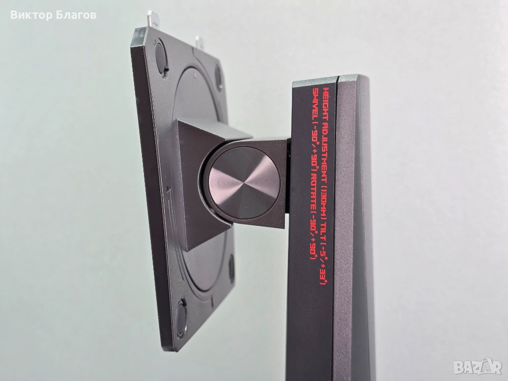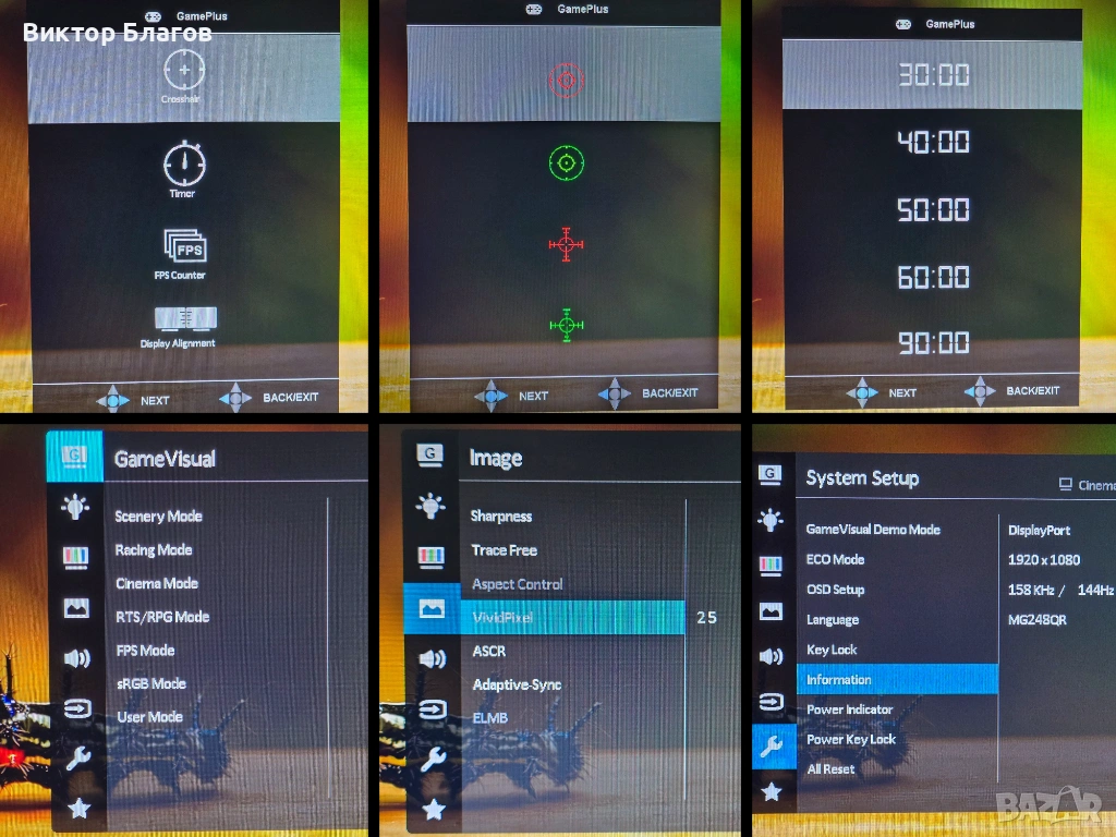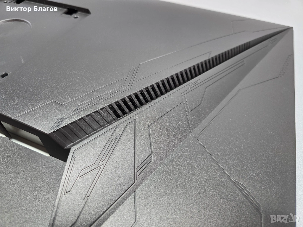 Монитора има вградени говорители. Може да се завърти вертикално. Има меню с мерник, таймер, FPS брояч, настройка на яркост, цветове и много други.
