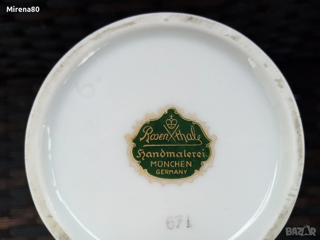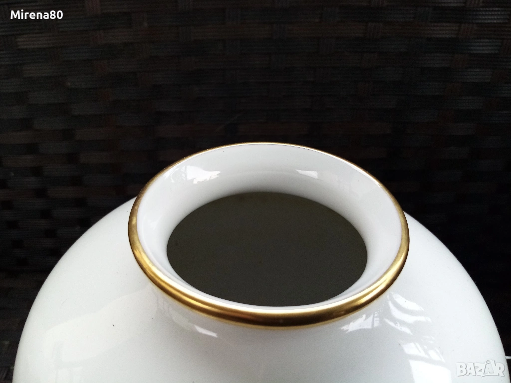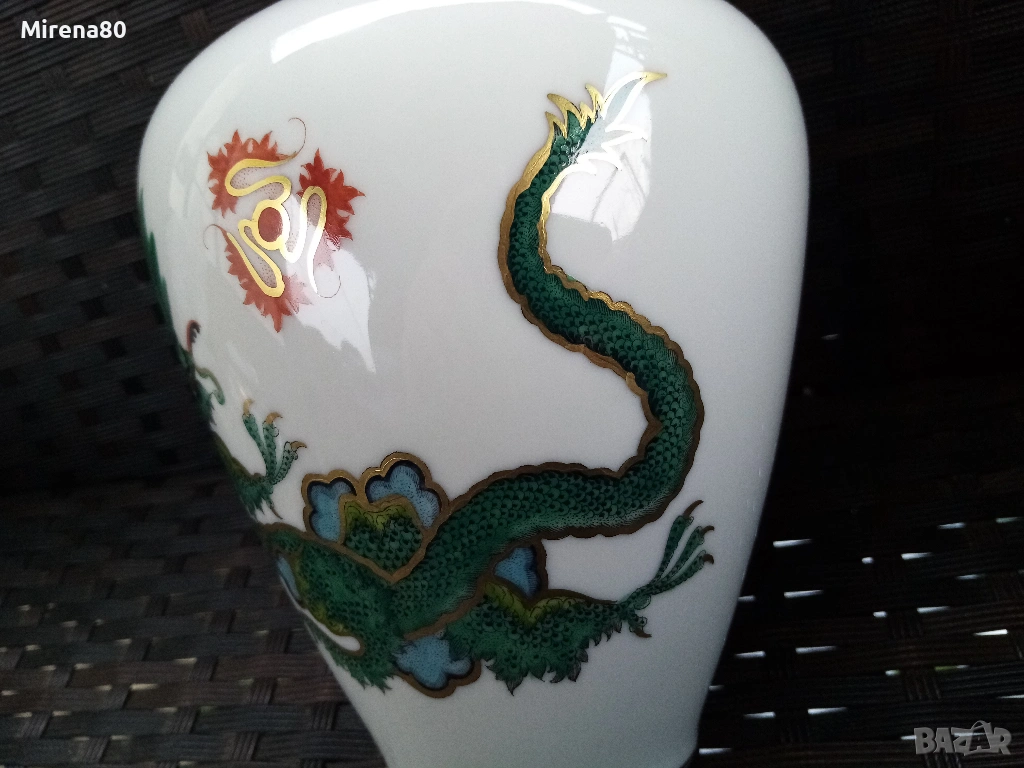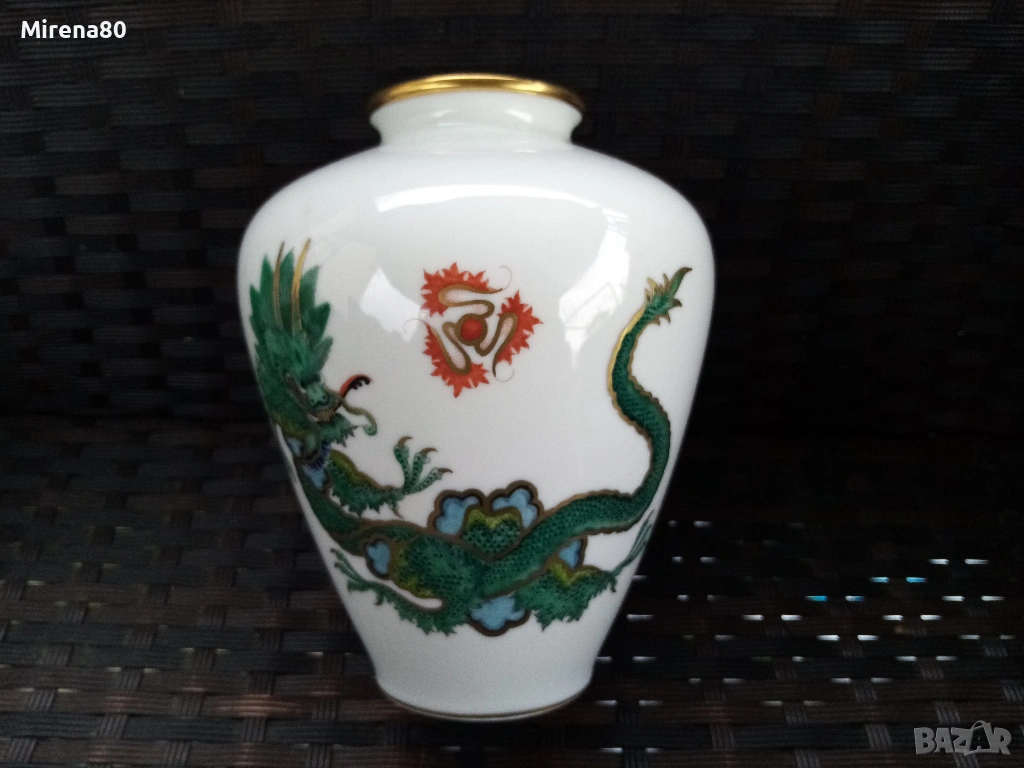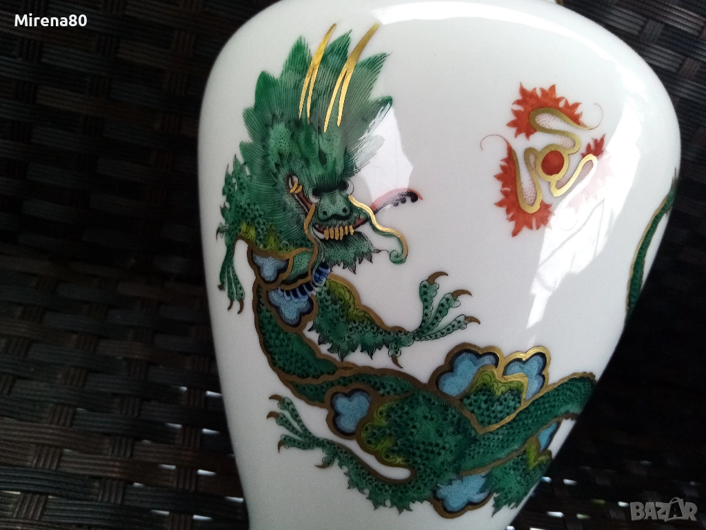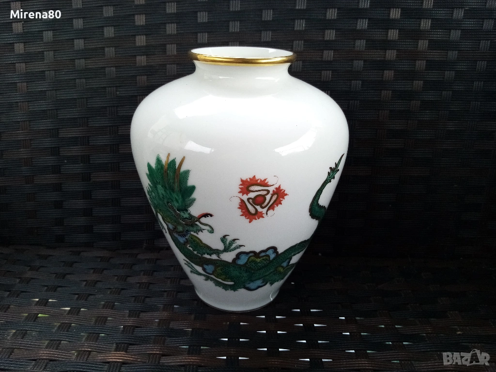 Представям ви невероятна находка - великолепна ваза на Розентал, произведена през 20-ти век, в перфектно състояние - все едно е нова. Безупречен златен кант, ръчен рисунък, изображения на дракон-минг и огнено кълбо. Много реалистичен и детайлен ! Вис. 19 см, диам. 13 см.