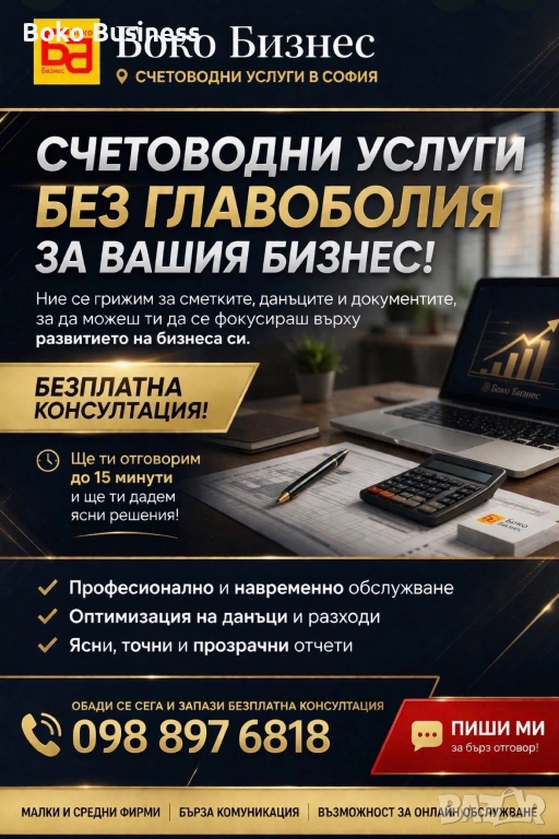 Боко Бизнес е счетоводна кантора, базирана в София, основана през 2012 г. Специализираме в предоставянето на професионални счетоводни, данъчни и консултантски услуги. Нашата цел е да осигурим надеждно и коректно счетоводно обслужване, съобразено с изискванията на действащото законодателство.