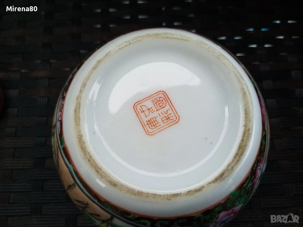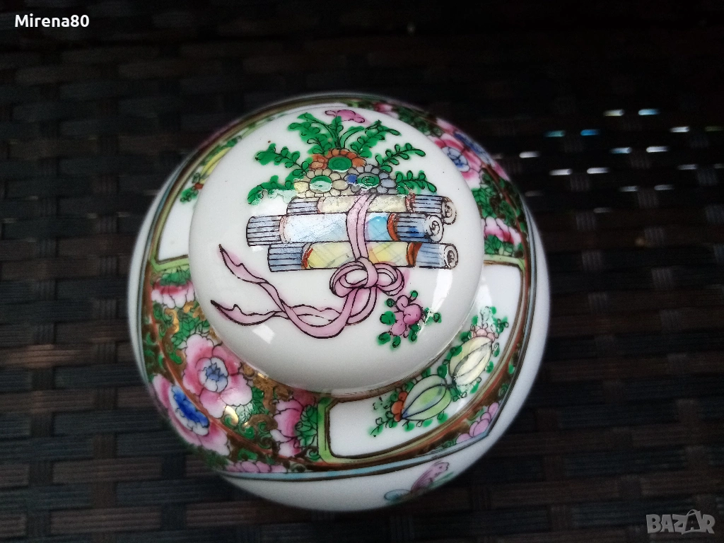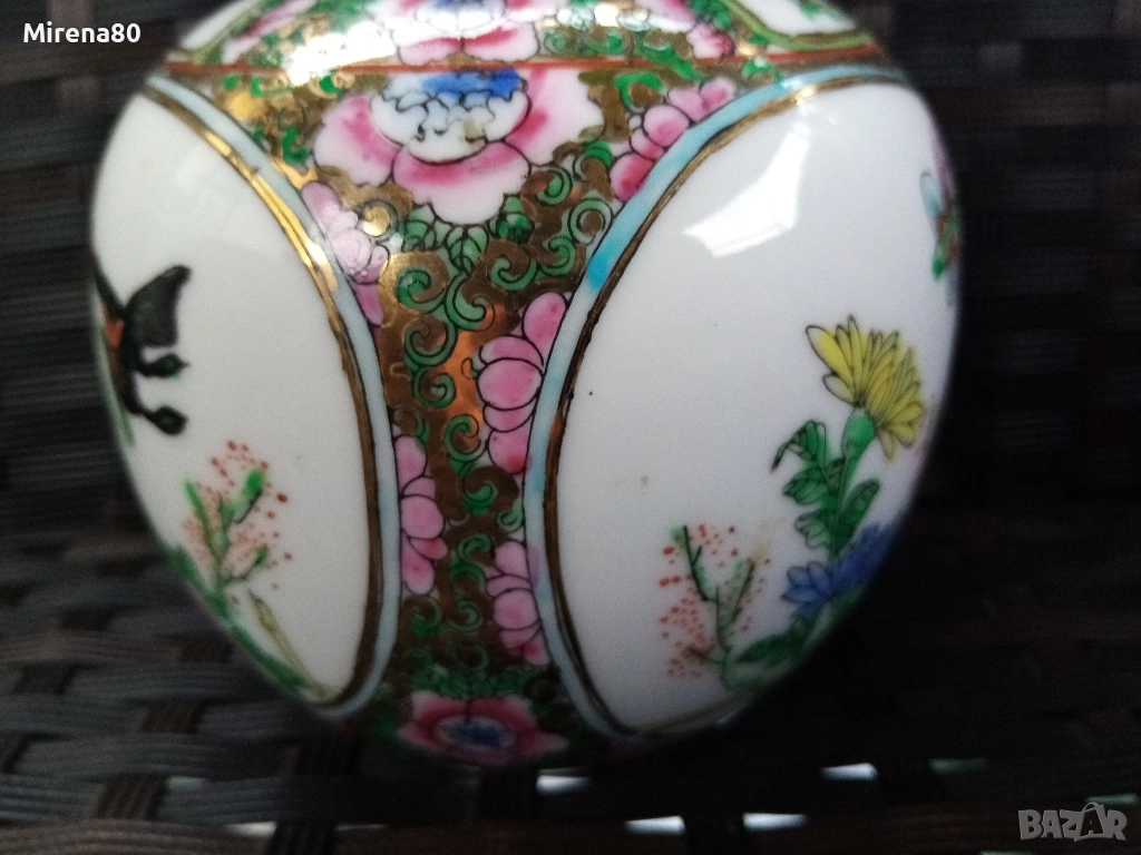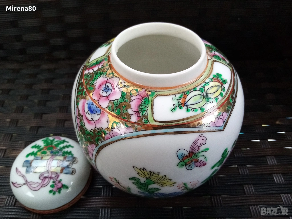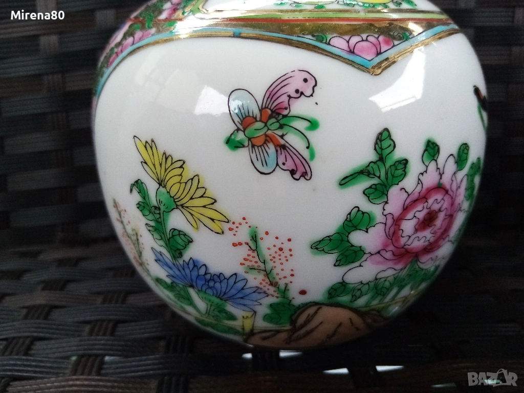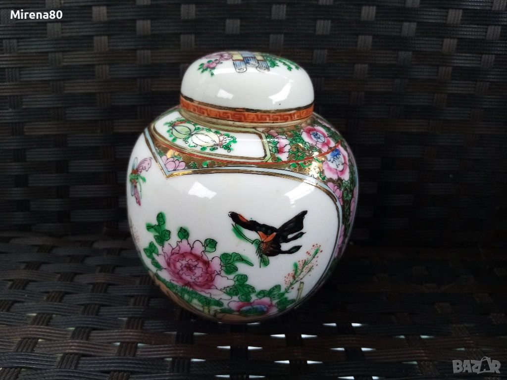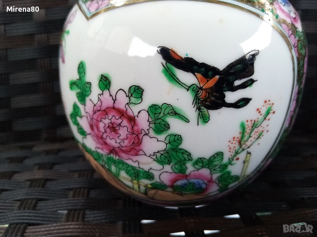 Стар порцеланов буркан за чаени листенца - от времето, когато това е било много ценна и скъпа стока. Вътре са съхранявали скъпоценните листенца чай, а в днешно време служи като декоративен предмет или колекционерска стойност. Бурканът е много красив - с ръчно рисувани традиционни за порцелана от изтока мотиви - пищни рози, пеперуди и златни акценти. Вис. 12, диам. 11 см. Отлично състояние !