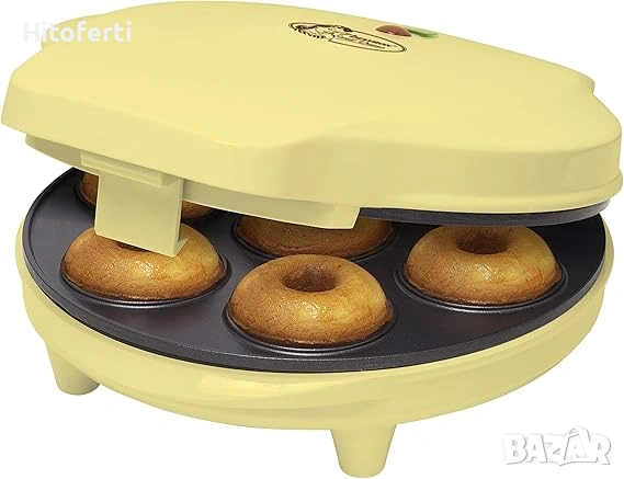 Съдържание на кутията: 1 x машина за понички Bestron, мощност 700 W, тегло 1,25 кг, материал пластмаса/метал, размери 25,5 x 20 x 9,5 см, жълта, ADM218SD