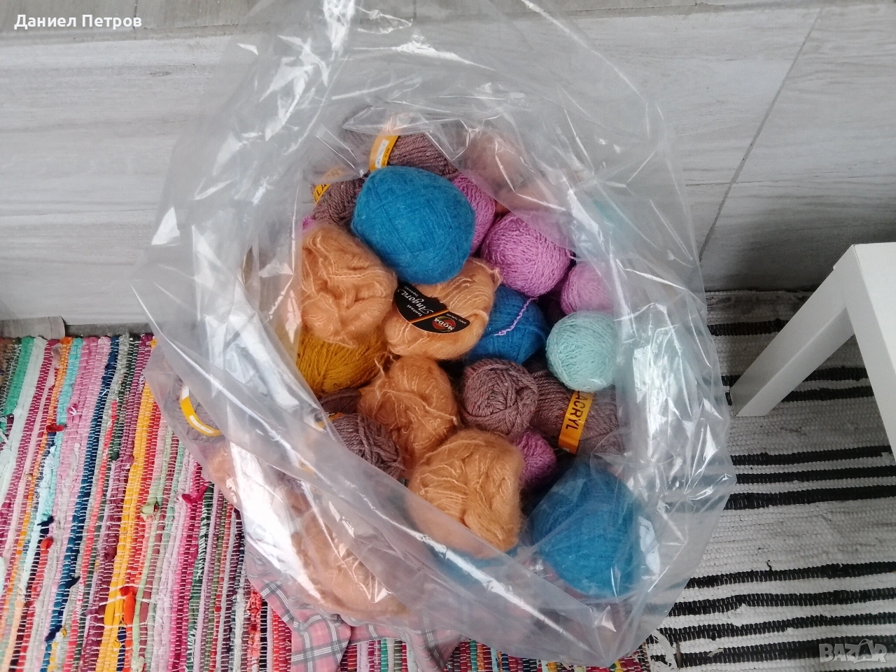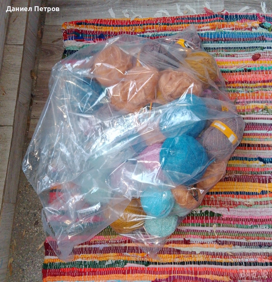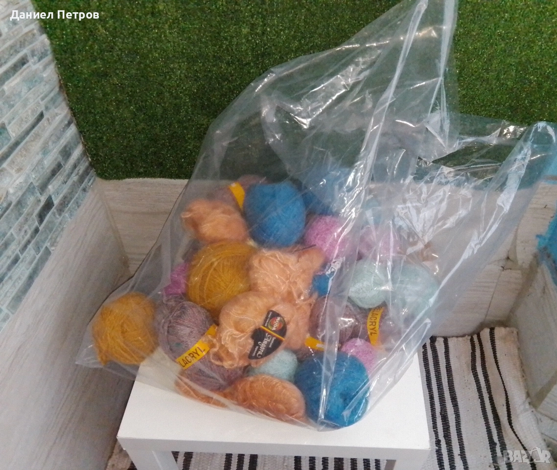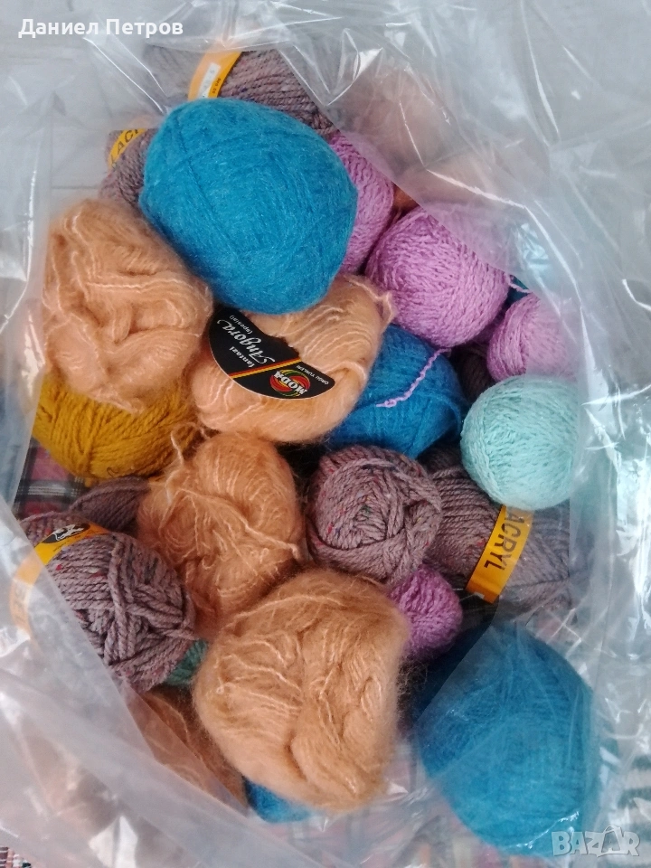 Прежда различни видове и цветове, част от нея е с етикети. Приблизителното тегло е около 3 килограма. Снимките не я онагледяват добре. Ако проявявате интерес, пишете ми за повече информация. Цената е за целия чувал.