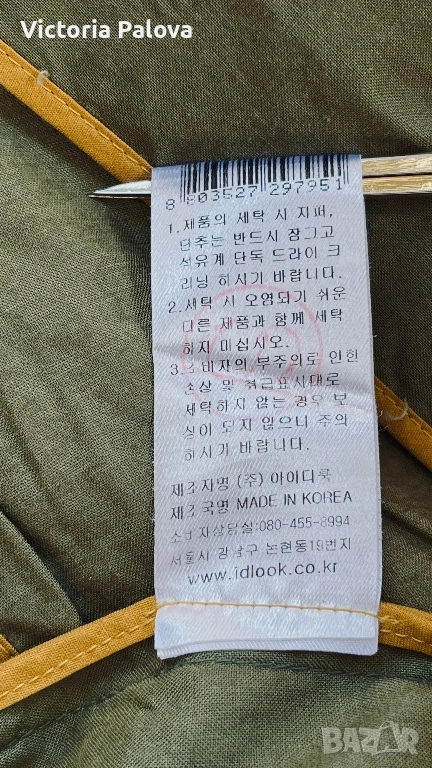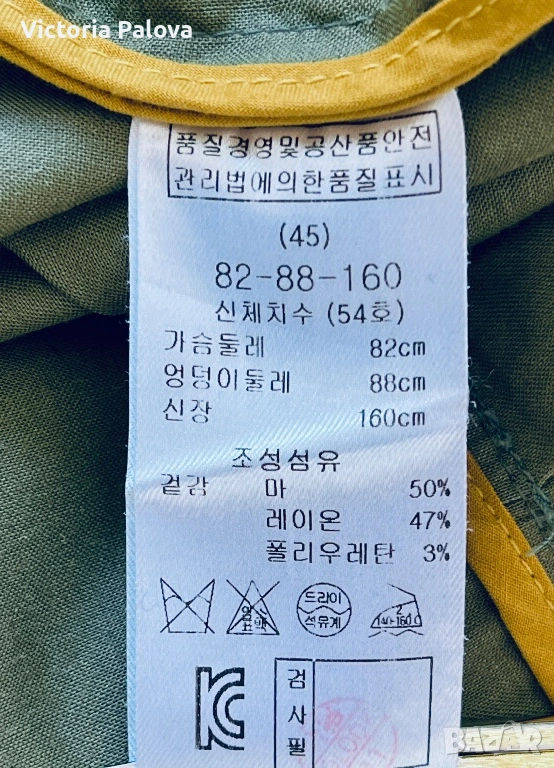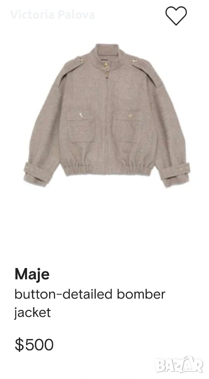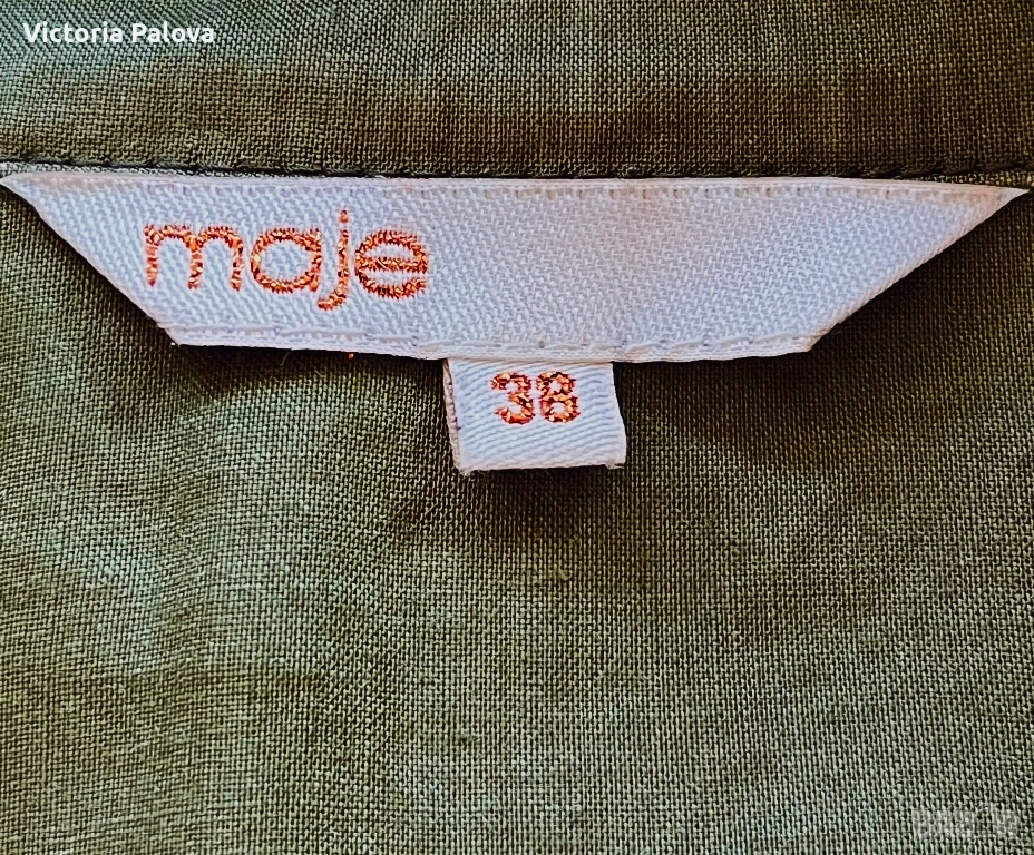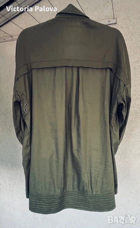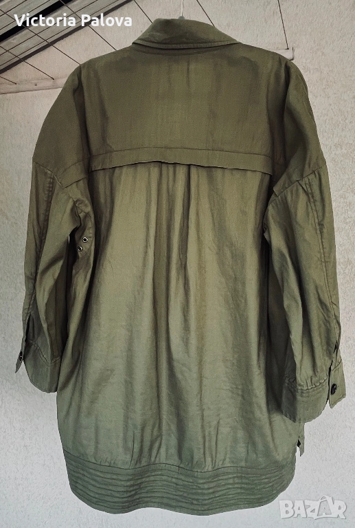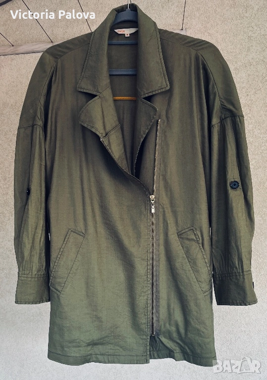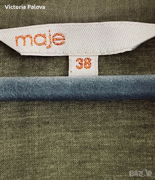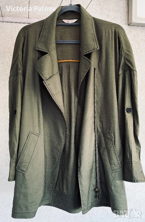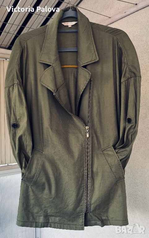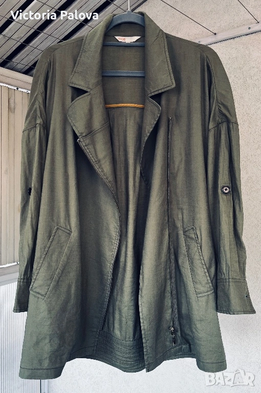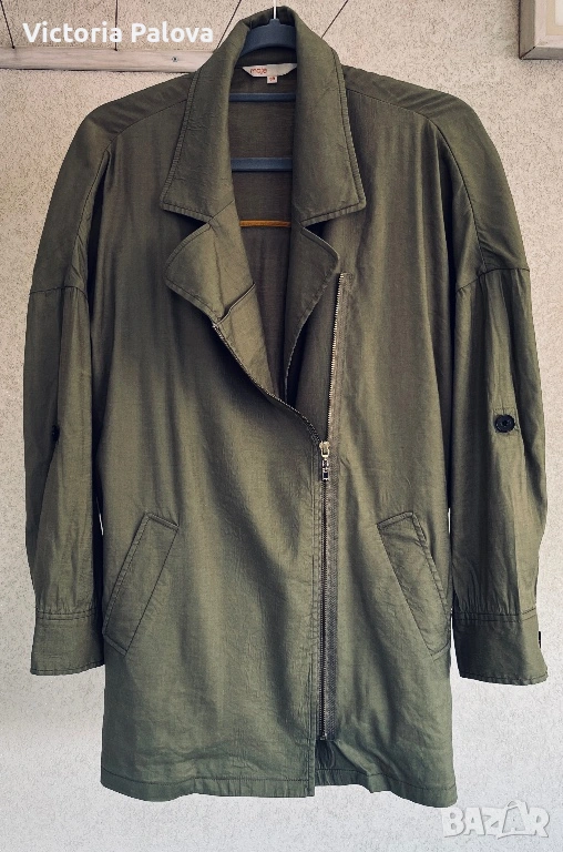 Луксозно дизайнерско яке на емблематичния френски бранд Maje, което е самото въплъщение на безупречния стил и истинския парижки шик. Тази уникална модна находка в ултрамодерен свободен силует поразява със своята прецизна асиметрия и дързък крой с метален цип, напомнящ за култовото рокерско яке в олекотено и невероятно елегантно изпълнение. Изтънченият и благороден маслинов цвят в съчетание с най-висок клас материя от естествен лен и коприна, създава изключително скъпа визия която мигновено приковава погледите. Платът е невероятно нежен при допир, дишащ и притежава характерния за коприната фин блясък, като едновременно с това пада тежко и придава структура на дрехата. Впечатляващи детайли, като ефектно падналата линия на рамото от 70 см и функционалните ръкави, които могат да се навиват и фиксират с изящни копчета, позволяват безкрайно да се експериментира със силуета. Благодарение на идеалните параметри с ширина от 61 см и стилен удължен гръб от 80 см, якето стои перфектно, осигурявайки пълна свобода на движение и градски шик. То е в безупречно състояние, буквално като ново, истинско бижу в колекцията , подчертаващо изключителен вкус и висока класа.