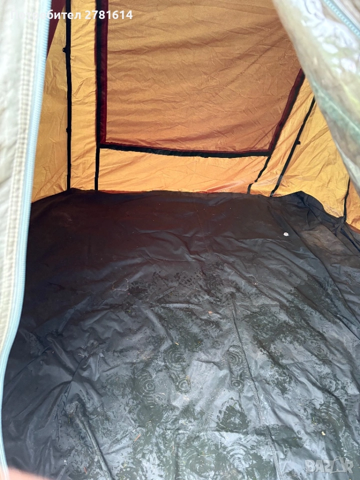 Палатката има лека забележка на покривалото за дъжд .Вратата е в перфектно състояние не влиза вода.Всичко останало е перфектно . Има и колчета за разпъване на вратата да стане като тента.
