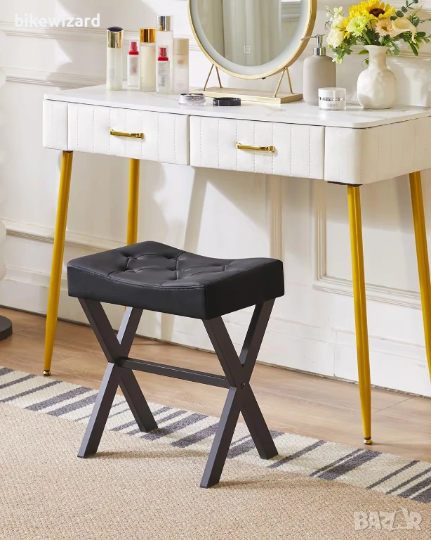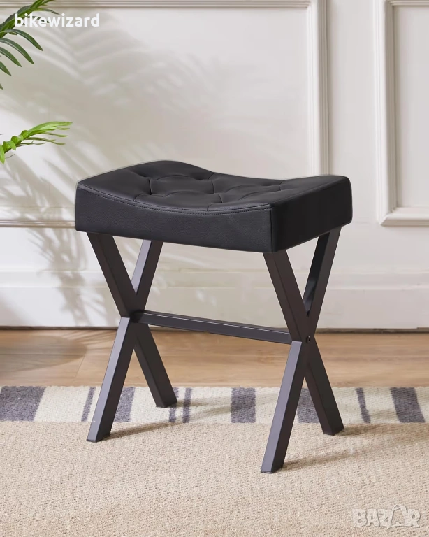 Високо качество: Този стол е с U-образен дизайн на повърхността, пълен с мека гъба, която по-добре пасва на вашата телесна структура и ви осигурява комфортно изживяване. Същевременно, този стол се предлага в два варианта: лен и синтетична кожа, съчетани с черни метални крака с форма на X, за да се гарантира издръжливост и да се подобри естетиката на продукта. Цвят и размер: Размерът на стола е 15,55 * 11,61 * 17,71 инча (39,5 * 29,5 * 45 см), което е удобно за съхранение и подходящо за височината на повечето масички за гримиране. Предлагат се и множество цветове, от които да избирате, което може да добави елегантност към вашия дом. Многофункционални приложения: Този стол може да се използва не само като стол за гримиране, но може да се постави и до диван или легло като поставка за крака, във входното фоайе като стол за преобличане на обувки, а също така може да служи като малка странична маса за поставяне на малки предмети като чаши за чай и книги. Лесен монтаж: Съгласно приложените инструкции за монтаж, продуктът може да се сглоби в рамките на десет минути, което е много просто и удобно.