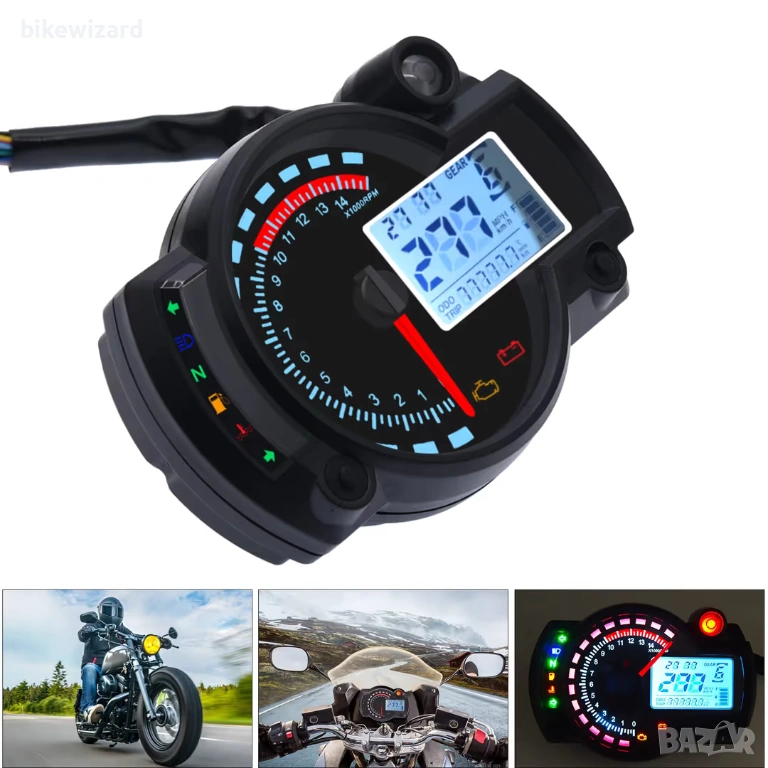 Цифров скоростомер за мотоциклет LCD тахометър 0–299 км/ч 14000 об/мин 7-цветна подсветка – RX2N НОВ → Обява 54152814