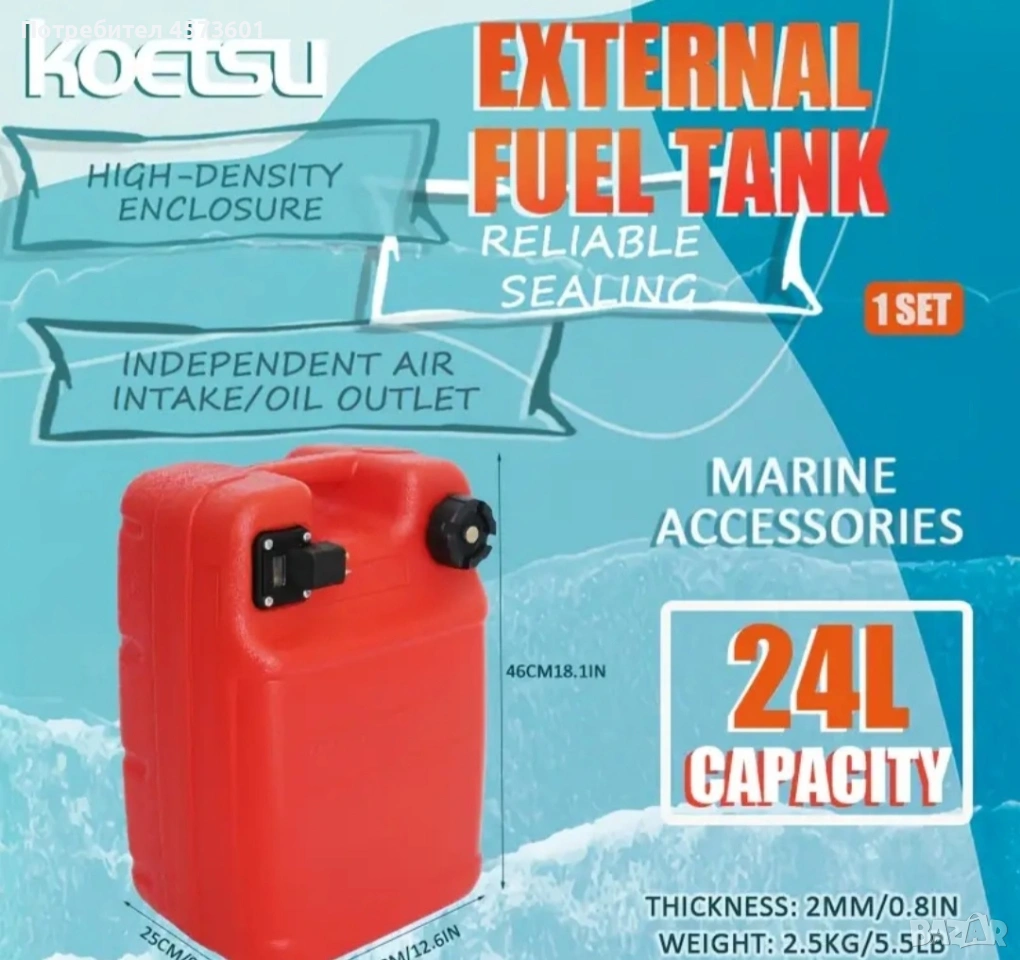 Чисто нови, не разпечатани комплекти! Резервоар за гориво: Резервоар, подходящ за употреба на лодки кемпери каравани бусове камиони багери и др. техника Позволява ви да увеличите капацитета на гориво. Вместимост 24литра достаточен за да увеличи времето за използване на вашето превозно средство на вода и на суша. Устойчив материал: Резервоарът е изработен от устойчив HDPE материал (подсилен полиетилен). Устойчив на атмосферни условия и други елементи. Лесен монтаж: Резервоарът се монтира лесно. Резервоара са снабден със сонда, филтър, ръчна помпа с дължина на маркучи 3 метра, за лесно и чисто пълнене и източване на гориво, нивомер за отчитане на горивото, вентилационен клапан на капака и удобен калъф- чанта за съхраняване. Цена комплект 70 евро.