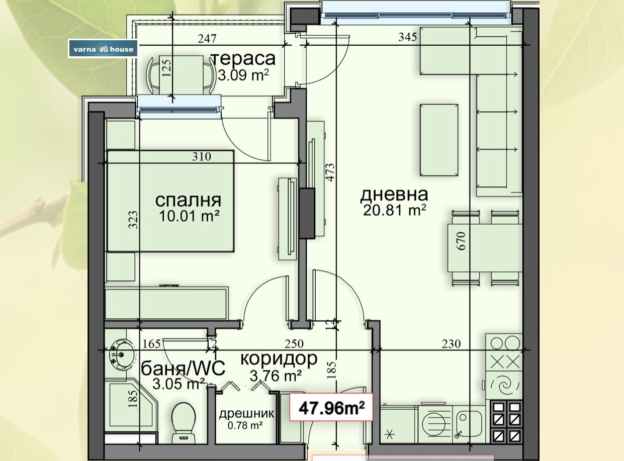 Жилището се състои от дневна-20.80 кв.м., спалня-10.01 кв.м., коридор-3.76 кв.м., санитарен възел-3.05 кв.м., килер-0.78 кв.м., тераса-3.09 кв.м. От дневната и спалнята има излаз към терасата.