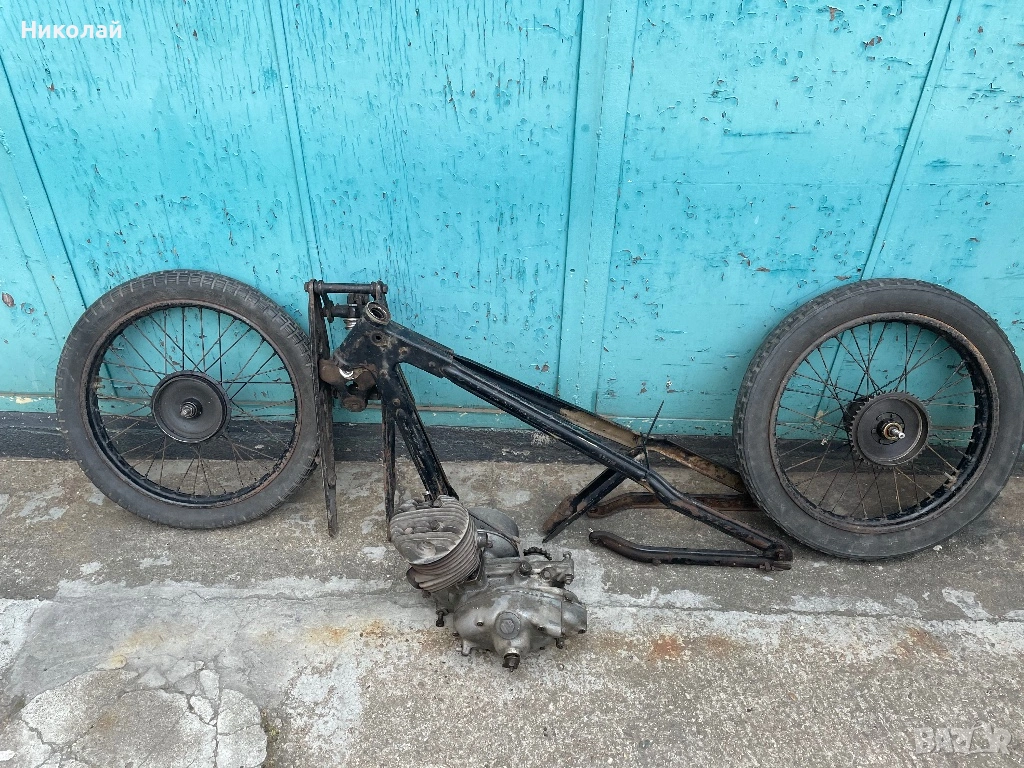 Рама , двигател , палеограмна предница и двете джанти това са наличните неща който имам . Рамата няма кривини , двигателят не е блокирал и скоростите включват , джантите са прави. При интерес мога да изпратя подробни снимки.