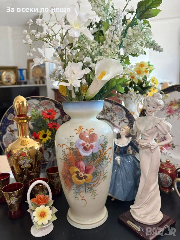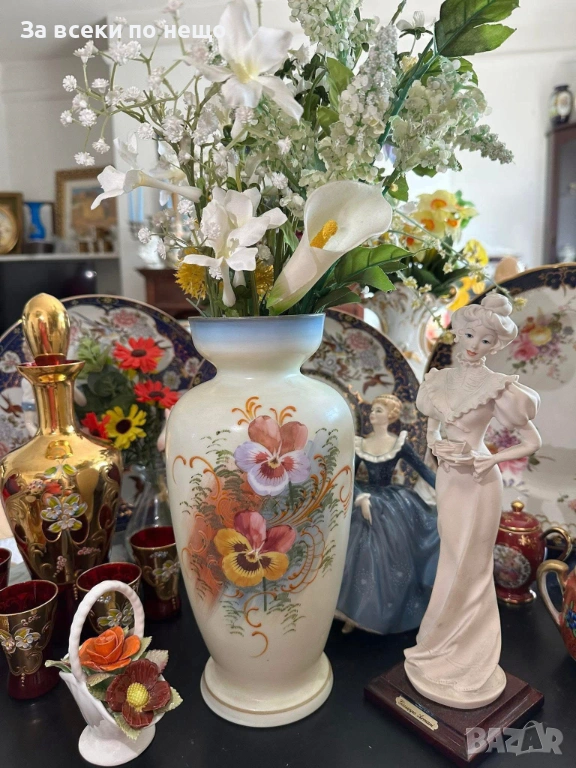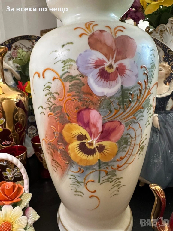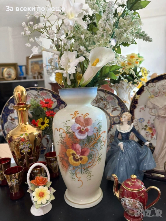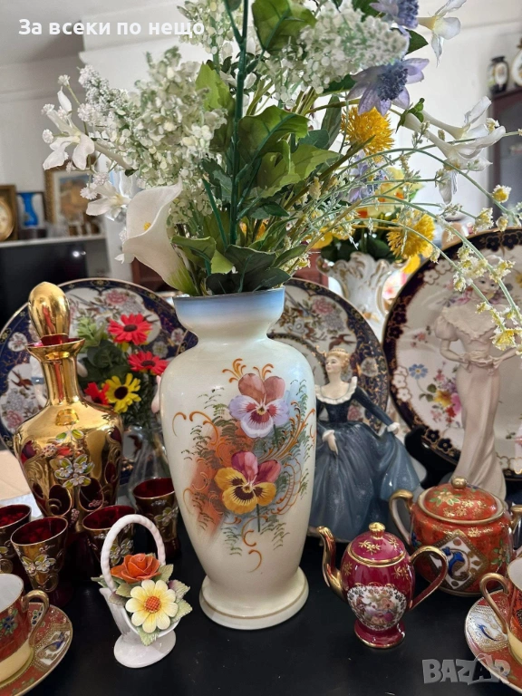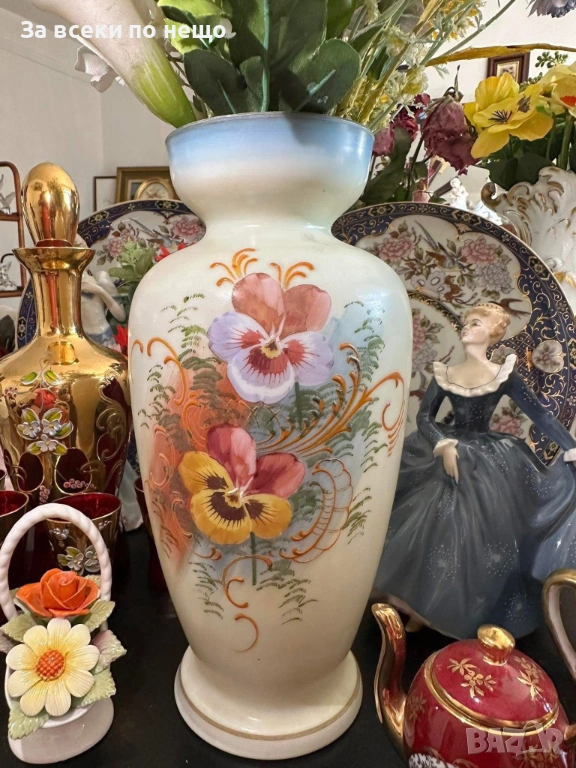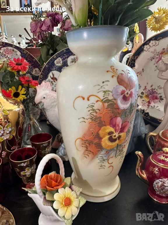 Made in France Napoleon III Hand Painted Opaline Vase with Yellow Bottom Bandage, c1890 - изящна ръчна рисунка върху опалин, великолепни цветя с леки релефни мотиви, изумително качество и невероятна красота, 27 см изящество от 19 век! Прекрасен десен, жестока класа,изключителна визия и изящество!