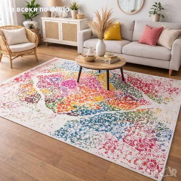 Цветен щампован килим с вдъхновен от етно и бохо стил дизайн, който внася енергия и настроение във всяко помещение. Ярките акценти в червено, жълто, синьо и зелено превръщат този модел в истински фокус на интериора.