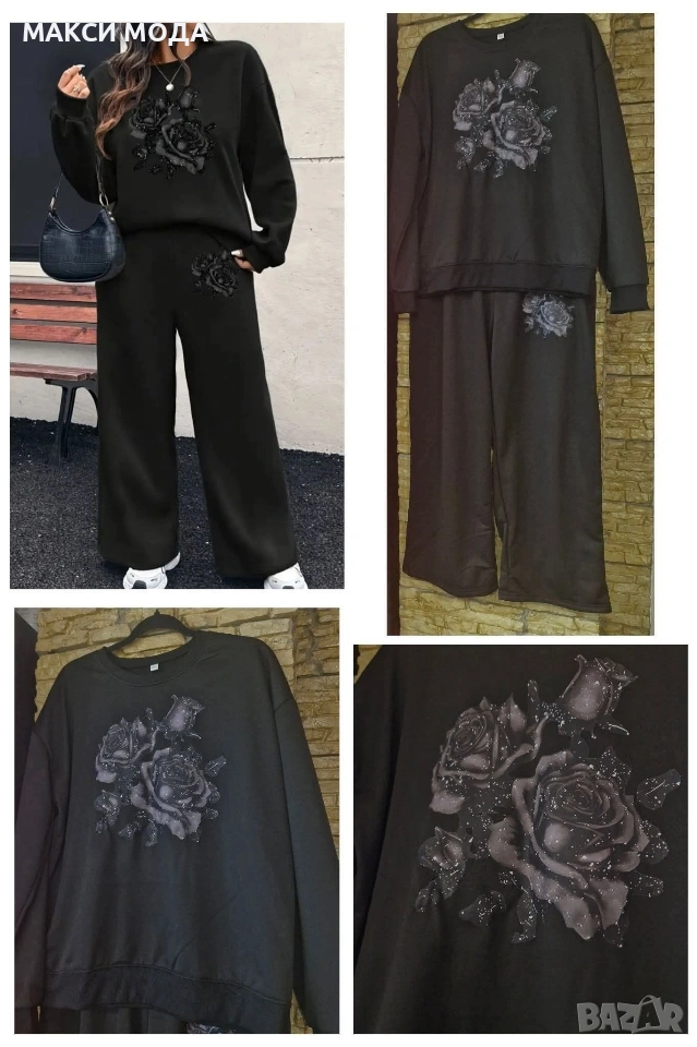 Нов комплект 3/4ХЛ Цвят черен Полиестер, плътен Горнище - гръдна 130/145 см, ханш 118/145 см, дължина 69 см Долнище - с джобове, ластик и връзка, талия от 88 до 170 см, ханш от 148 до 168 см, за голям ханш Бедра обиколка 78/96 см, крачолите долу са с обиколка 60 см, дължина 105 см С голяма елактичност Мерките са дадени в свободно и разпънато състояние По етикет 2ХЛ, но и доста уголемен и по меркш отговоря на 3/4ХЛ 22€
