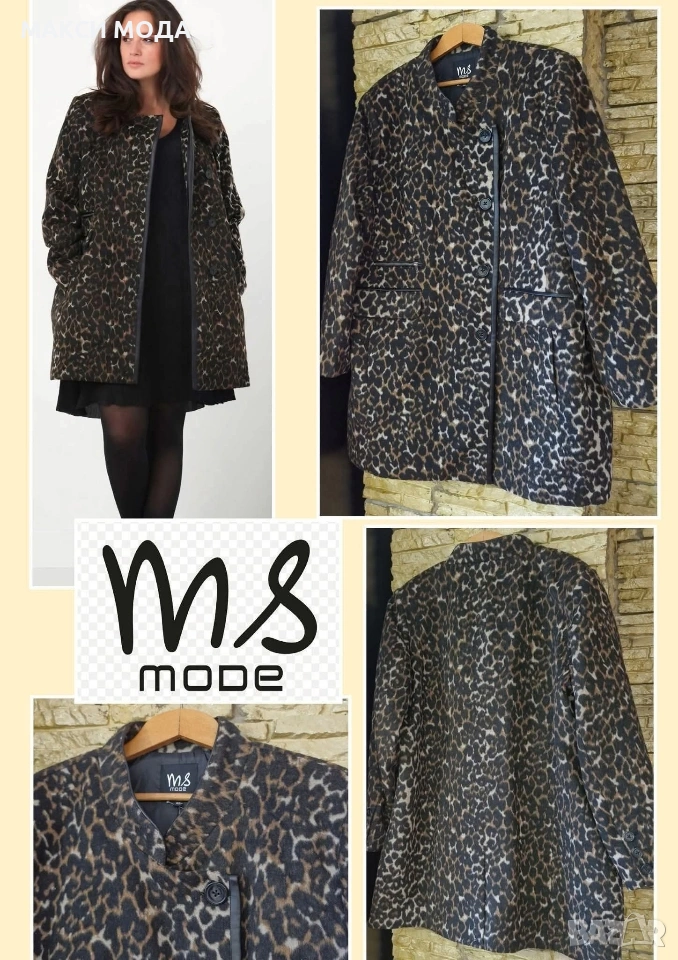 Ново пролетно палто MS mode Нидерландия Принт леопард в тъмни цветове Материя 67% полиестер, 23% акрил, 5% вълна, 3% др. С подплата полиестер Декорация с кант екокожа Гръдна 134 см Ханш 150 см Бицепс обиколка 47 см Дължина 92 см ❗️❗️❗️30€