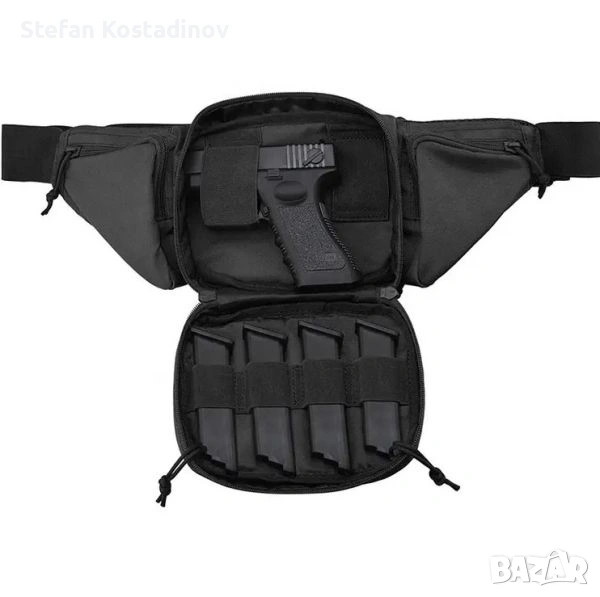 Нашата тактическа чанта е идеалното решение за носене на пистолет и пълнители, като предлага удобство, сигурност и функционалност. Проектирана за скрито носене, чантата разполага със специално отделение за пистолет, което може да се използва както от лявата, така и от дясната страна. Тя е подходяща за широка гама оръжия – от компактни и средни модели до пълноразмерни пистолети и револвери.