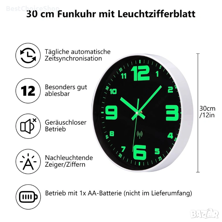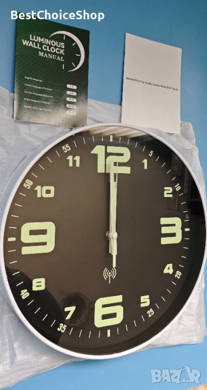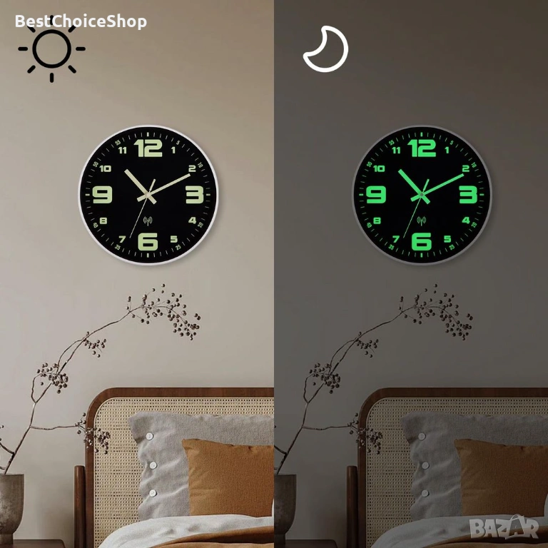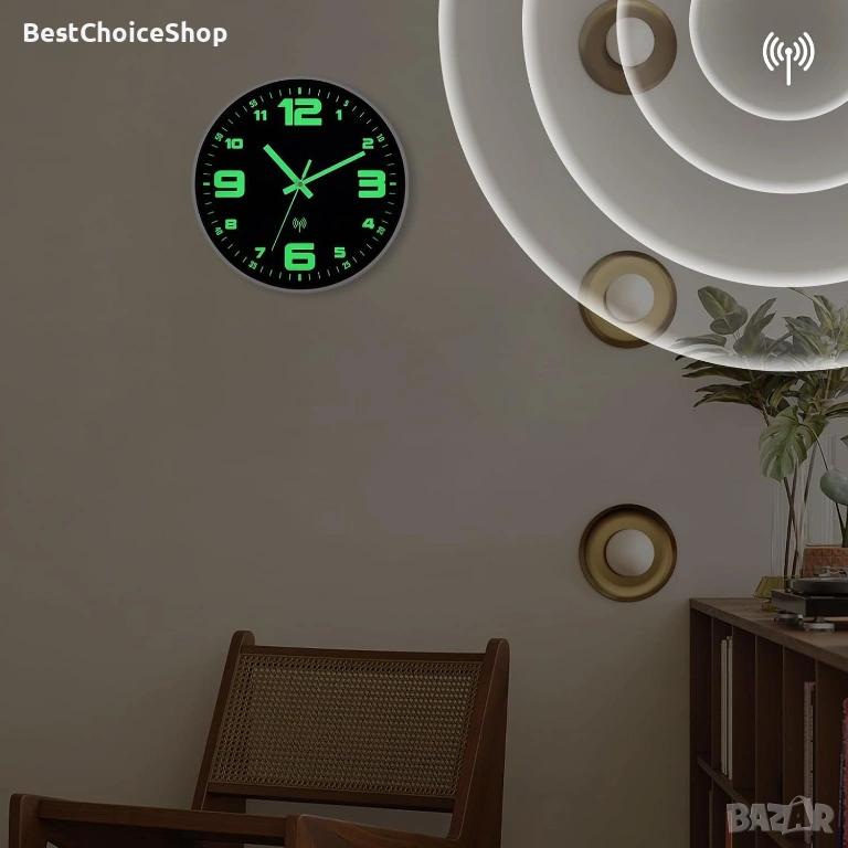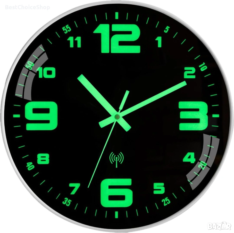Стенен часовник - 30 см.радиоуправляем, големи светещи в тъмното цифри, безшумен