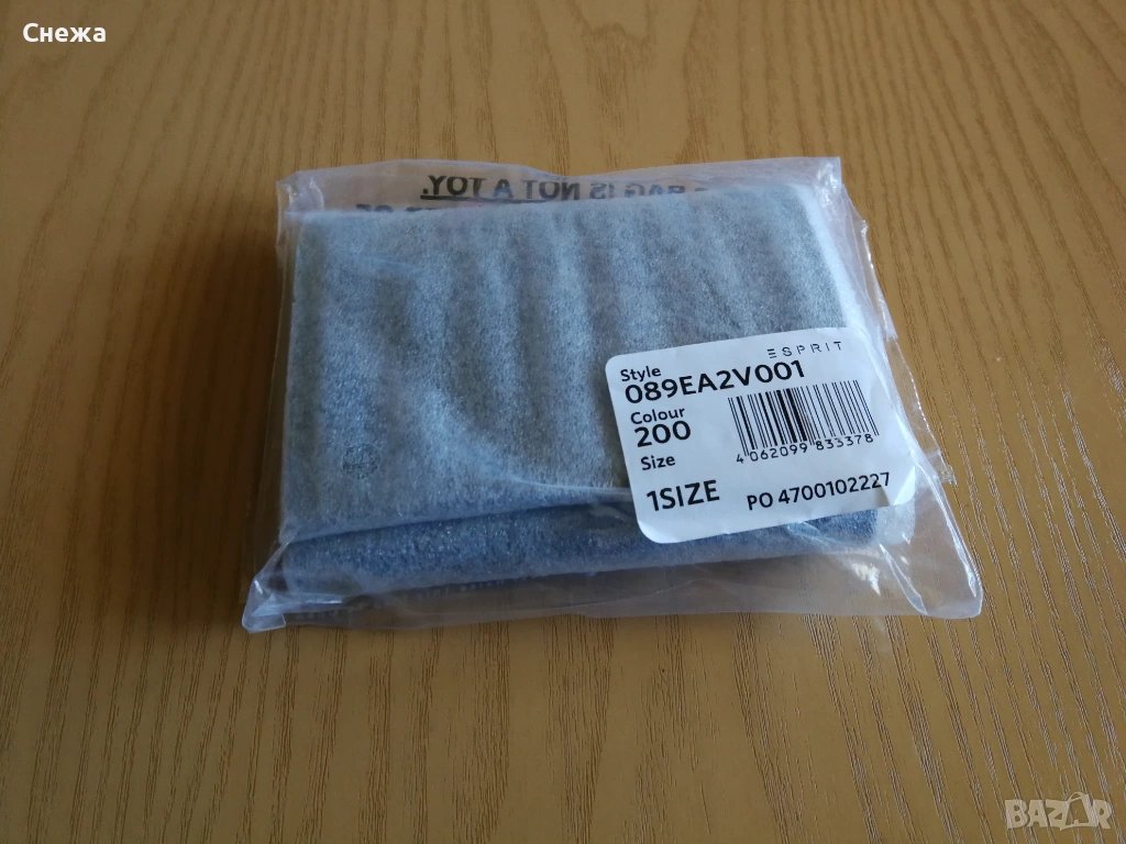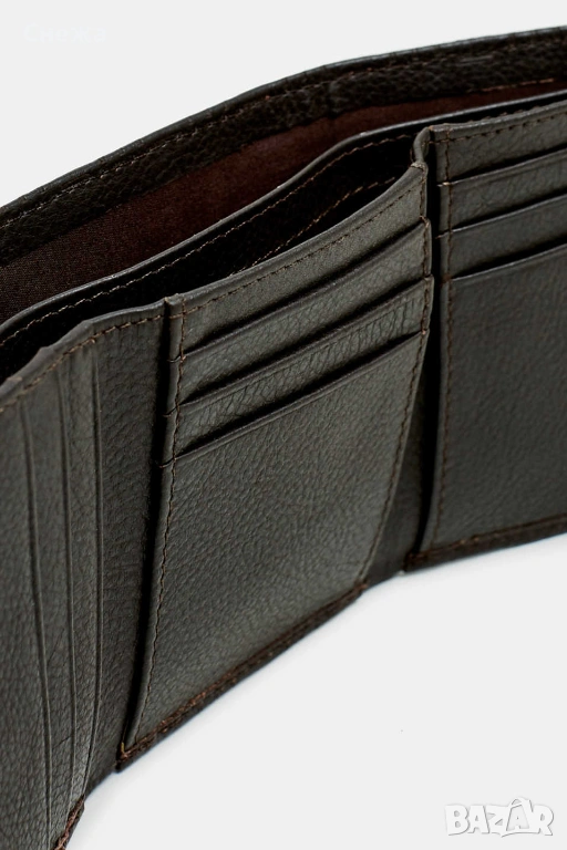 Портфейла е чисто нов с етикета и в оригиналната си найлонова опаковка. На фирмата Esprit e с номер на модела 089EA2V001. Вертикален тип е и е изработен от мека и приятна на допир "тъмнокафява" телешка естествена кожа, като в процеса на обработка са използвани натурални вещества. В по-голямата част кожата на портфейла е релефна с лого на фирмата "Е". Подплата от плат от вътрешната страна. Портфейла е малък и разполага с множество от отделения за карти или има общо:- 8 отделения за карти