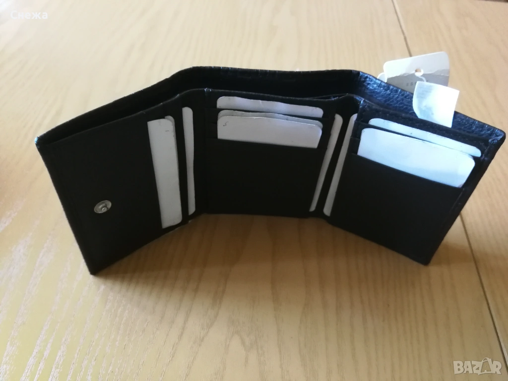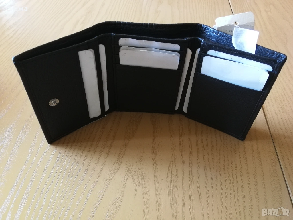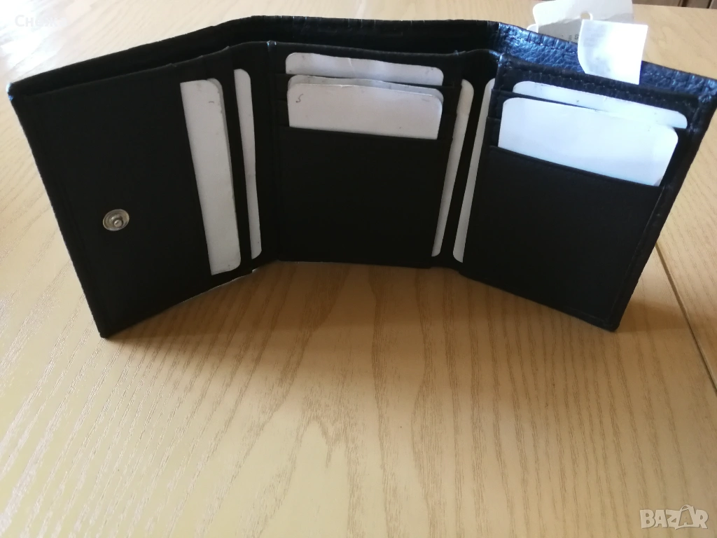 - 2 отделения за банкноти. Надпис на фирмата отпред на портфейла. Закопчава се посредством копче "Тик-Так". Портфейлът е със следните размери:- височина - 10.5 см.