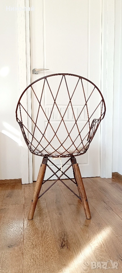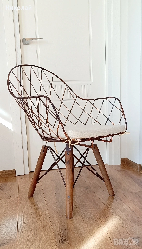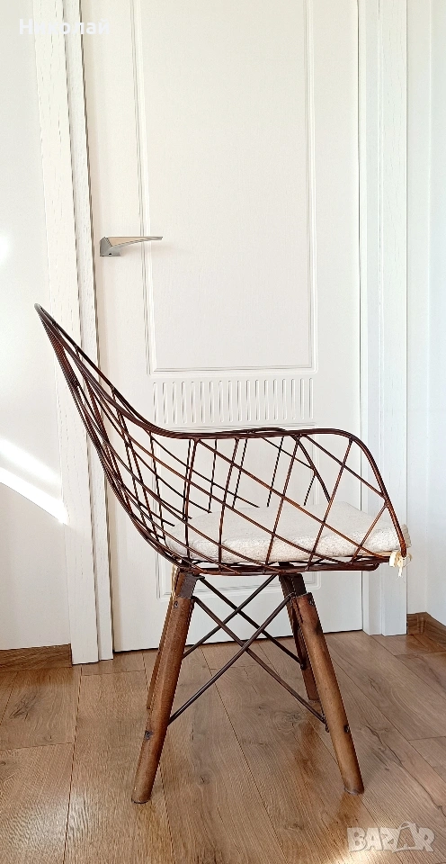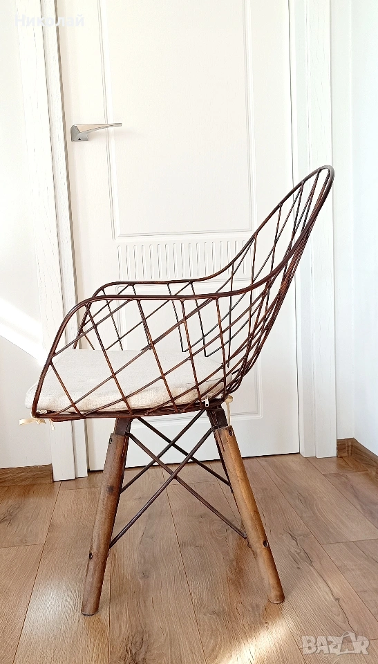 Трапезен стол - 4 броя. Цена за един брой - 50€. Материал на стола- метал, крака - дърво. Възглавниците са с цип, позволяваш пране на калъфките. Лично предаване за София. Размери: височина - 84 см.