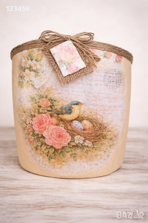 1. Декоративен кош „Гнездо“: Изработен от рециклирана основа, декориран с естествена юта и дантела.