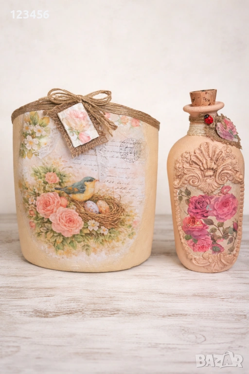 Уникален декоративен комплект в стил Прованс, изработен от рециклирани материали с декупажна техника.