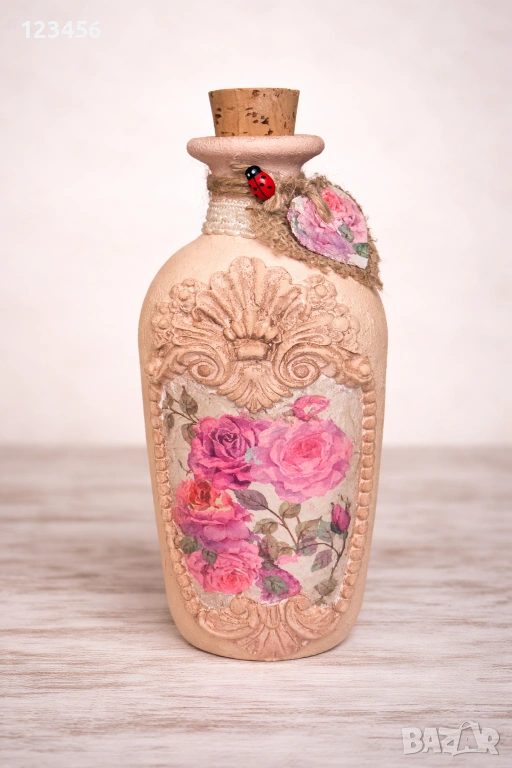 2. Ваза от рециклирано стъкло: Ръчно декорирана бутилка с нежни рози.