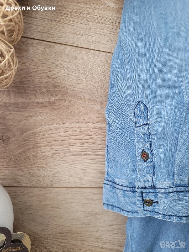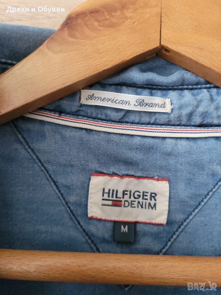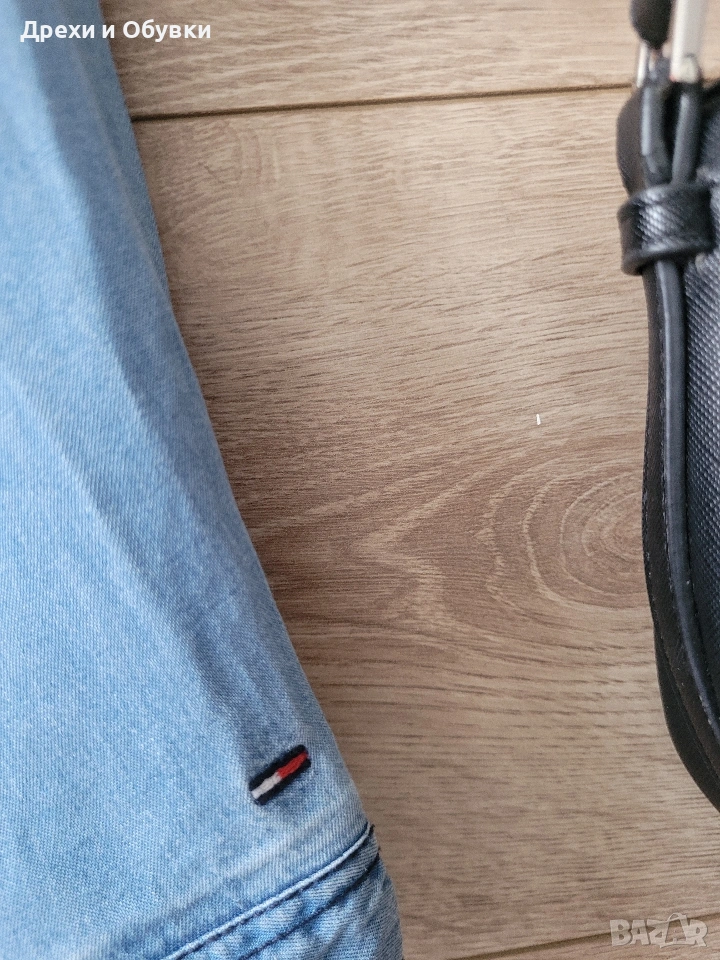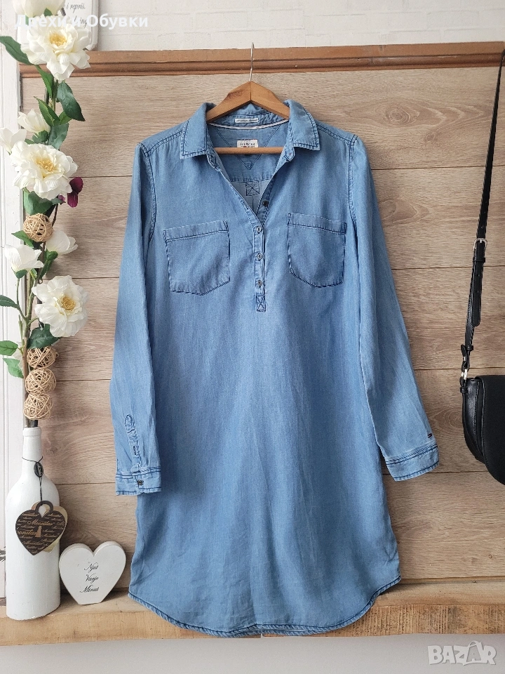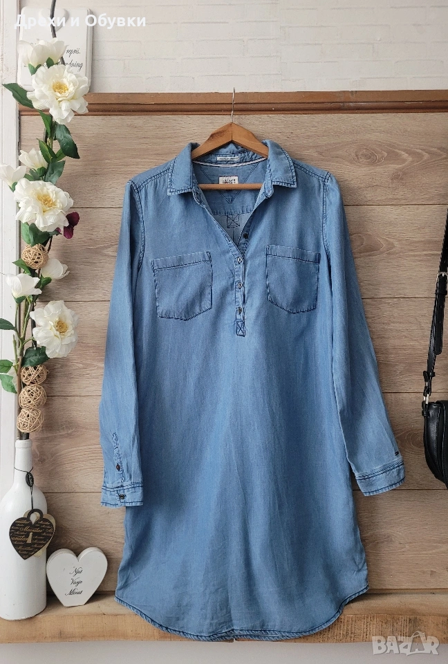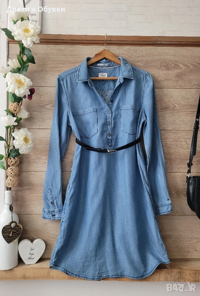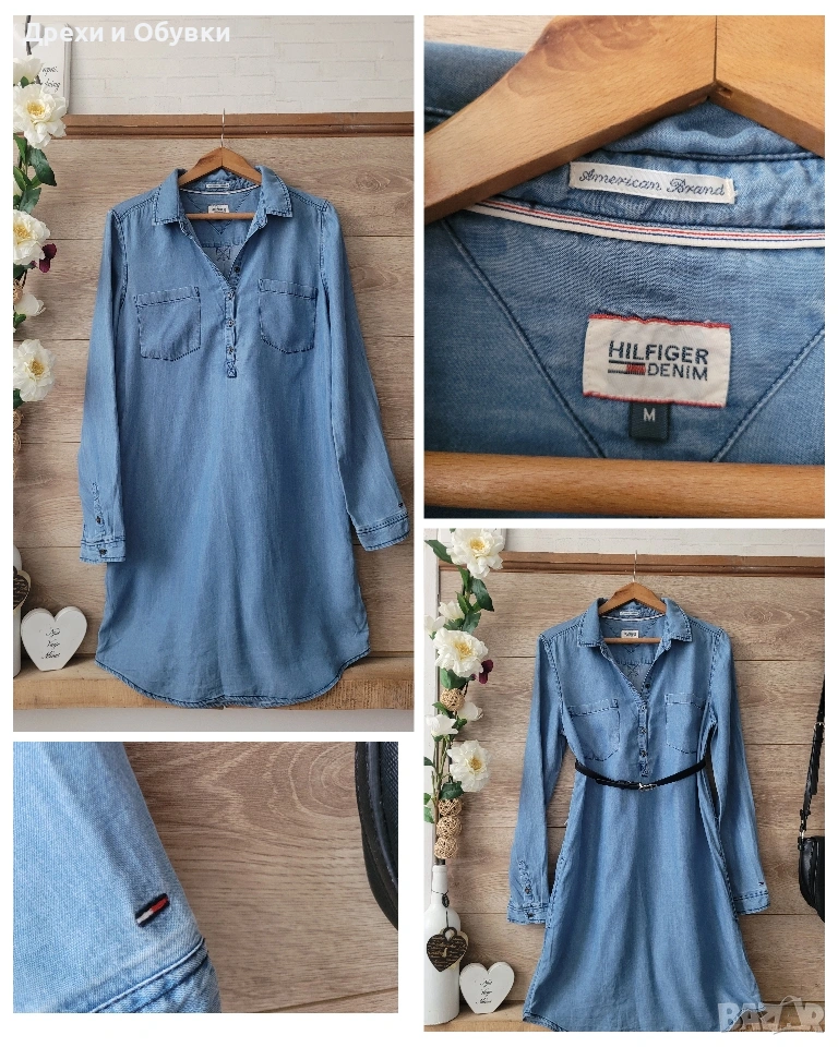 Оригиналня стилна и удобна рокля Tommy Hilfiger. Изработена в класически ризен стил. Моделът е тип denim shirt dress и се отличава с модерен, но непреходен дизайн – идеален за ежедневието. 🔹 Детайли: Класическа яка Частично закопчаване с копчета отпред Два предни джоба на гърдите и два странични джоба. Дълги ръкави Леко извита долна линия за по-женствен силует 🔹 Материя: 100% лиосел (lyocell) – мека, дишаща и изключително комфортна материя 🔹 Състояние: отлично Копчетата са със характерните за бранда конци червено и тъмно синьо. Перфектен избор за ежедневна визия – комбинира се лесно с маратонки, сандали или боти. Размер М Мерки: Дълга 90см, гръдна до 98см Цена 40€