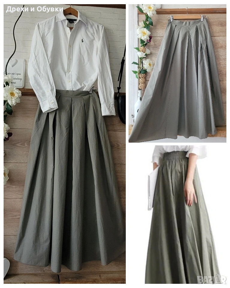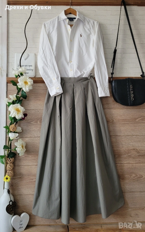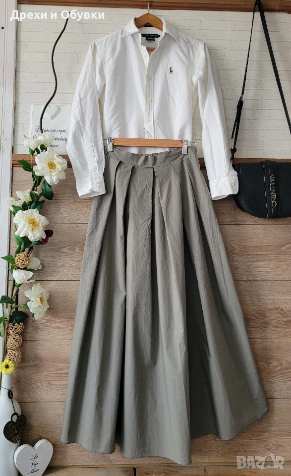 🌿 Елегантен дамски сет – POLO RALPH LAUREN + дълга пола 🌿 ( Може и по отделно) Красив и много стилен комплект, подходящ както за ежедневие, така и за по-елегантни поводи. 👔 Бяла риза POLO RALPH LAUREN • Размер: S/M Мерки: Гръдна 92см, дължина 60см • Оригинална марка • Класически модел с лого • Стои изключително елегантно и изчистено * памучна висококачествена материя Цена 55€ 👗 Дълга пола • Размер: S/M Мерки: дължина 90см, талия на ластик 33-40см • Материя: памук • Цвят: маслинено зелено • Висока талия с ластик – удобна и адаптивна • Разкроена кройка с обем – много женствен силует • Пада красиво и придава движение ✨ Комбинацията е изключително стилна – минималистична, но впечатляваща ✨ Подходяща за сезон пролет/лято/есен Цена на полата 20€ Цена за сета 70€