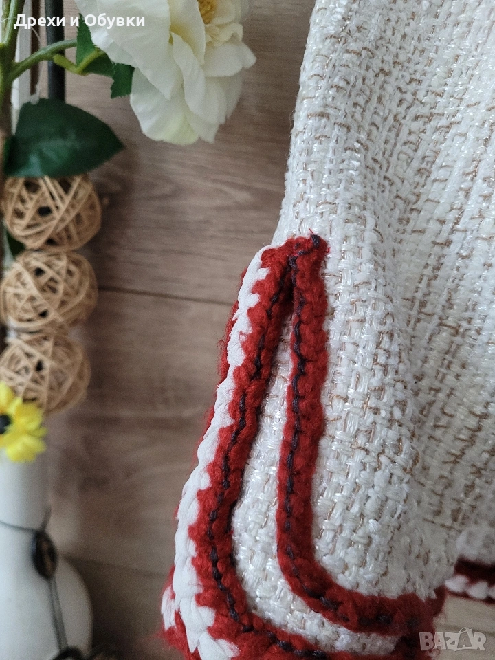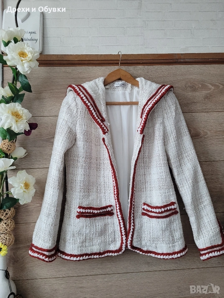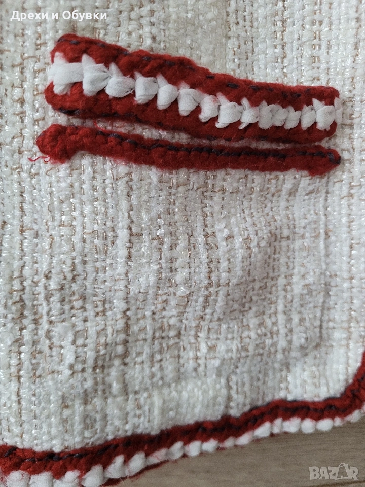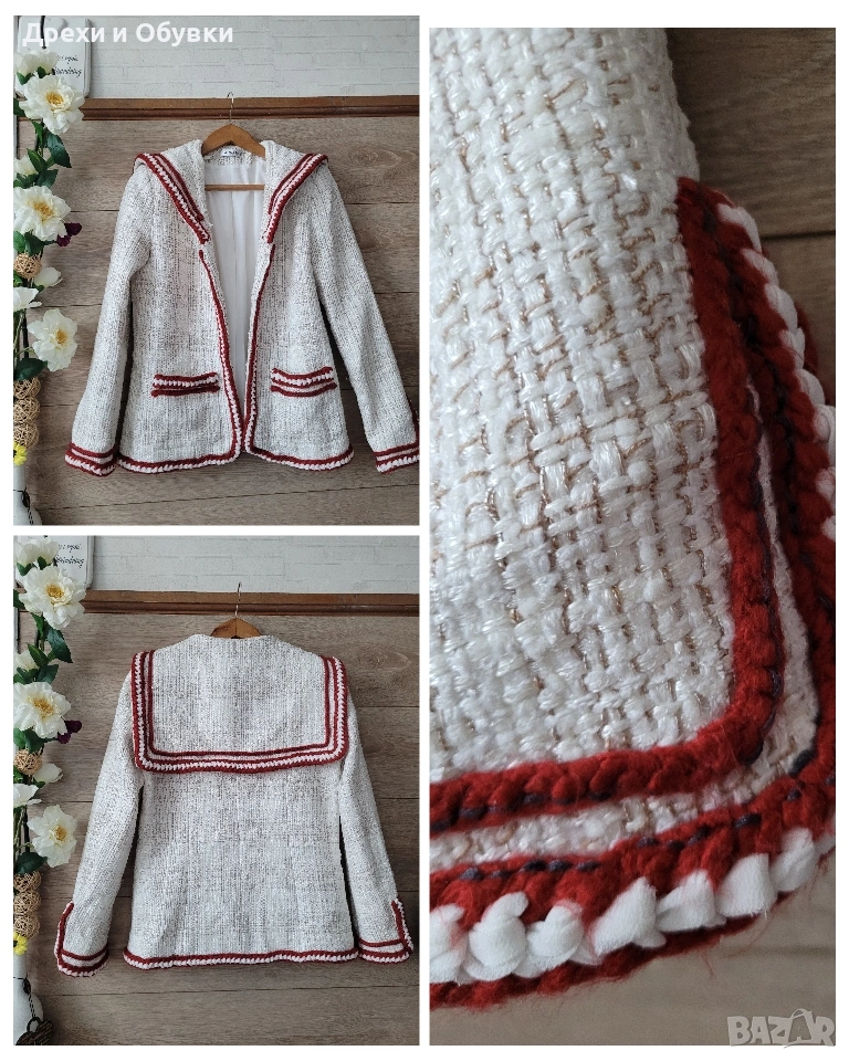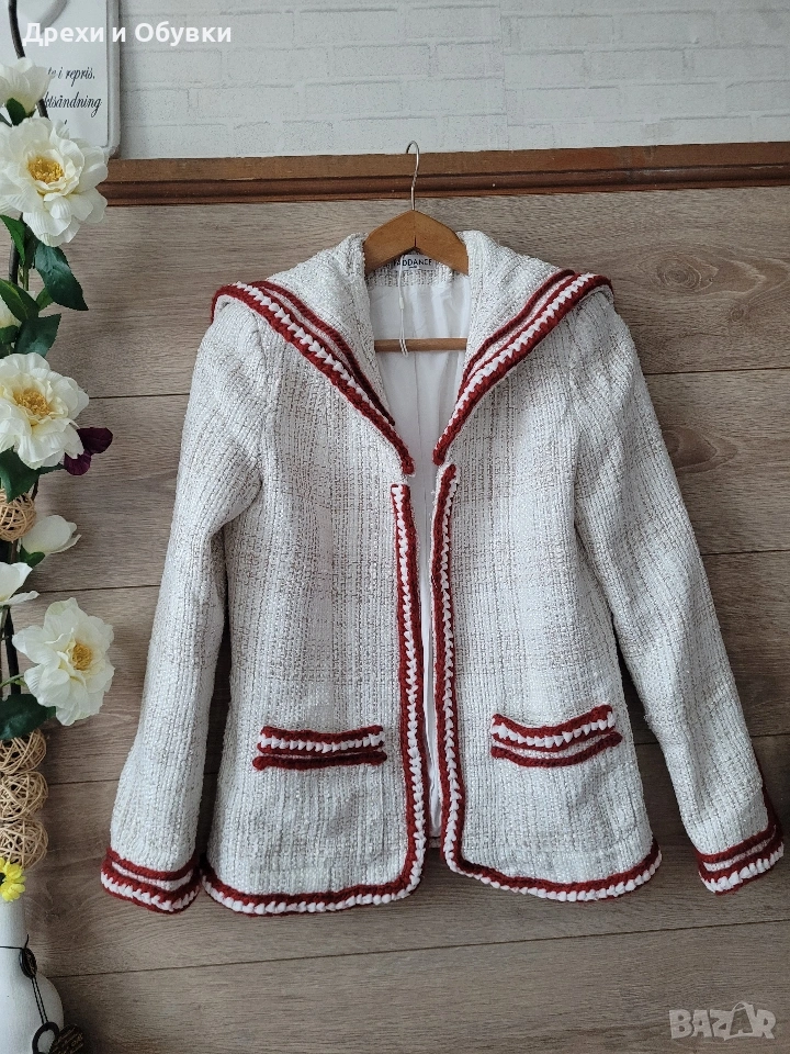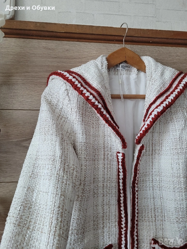 дамско сако в размер M (38) 🤍 FADDANSE PARIS Елегантен модел в с ефектни червени акценти, които придават характер и уникалност. Материята е с интересна текстура, наподобяваща ръчно тъкан плат, а декоративните кантове и детайли създават усещане за бутикова изработка. ✔ Размер: 38 (M) Гръдна 90-94см, дължина 60см ✔ Състояние: отлично ✔ Закопчаване: без копчета (отворен модел) ✔ Детайли: джобове, контрастни кантове, стилна яка . Подходящо както за ежедневна визия, така и за по-елегантни поводи. Лесно се комбинира с дънки, панталон или рокля. Цена 20€