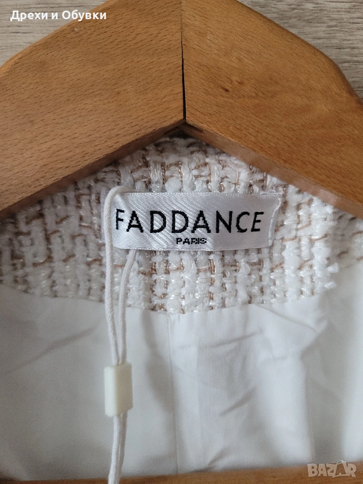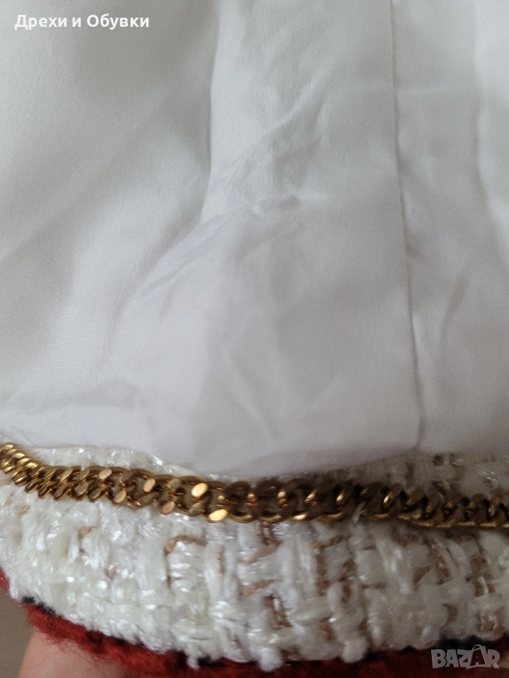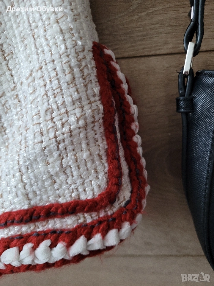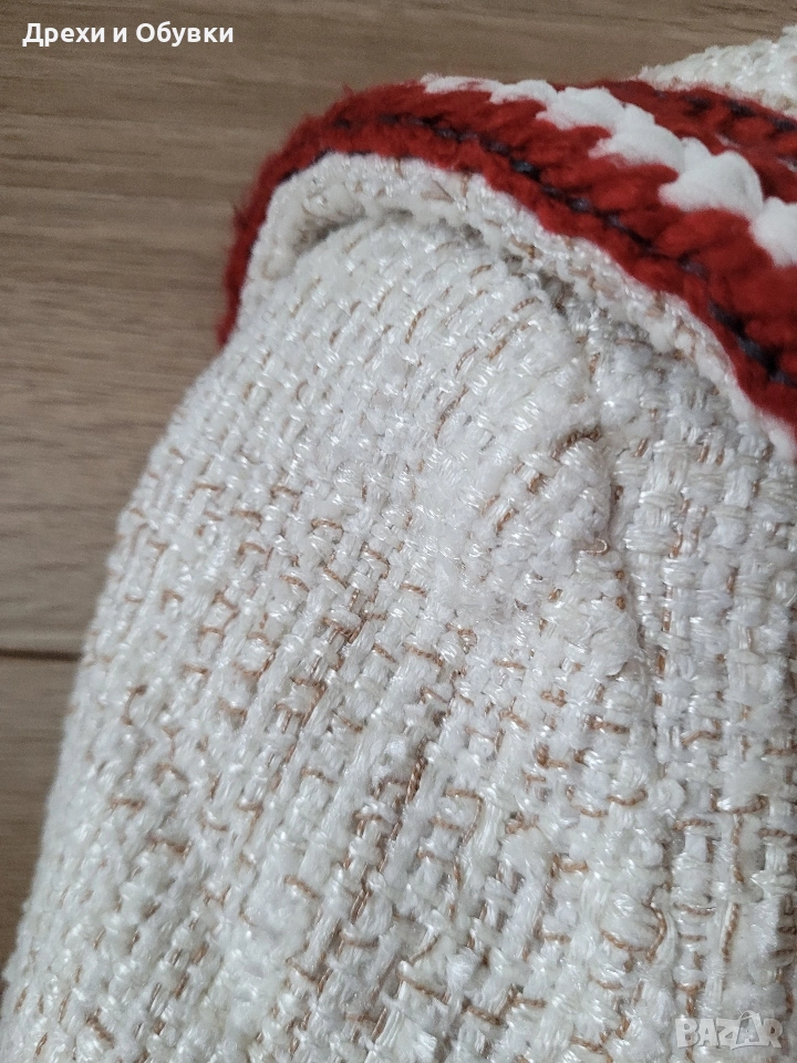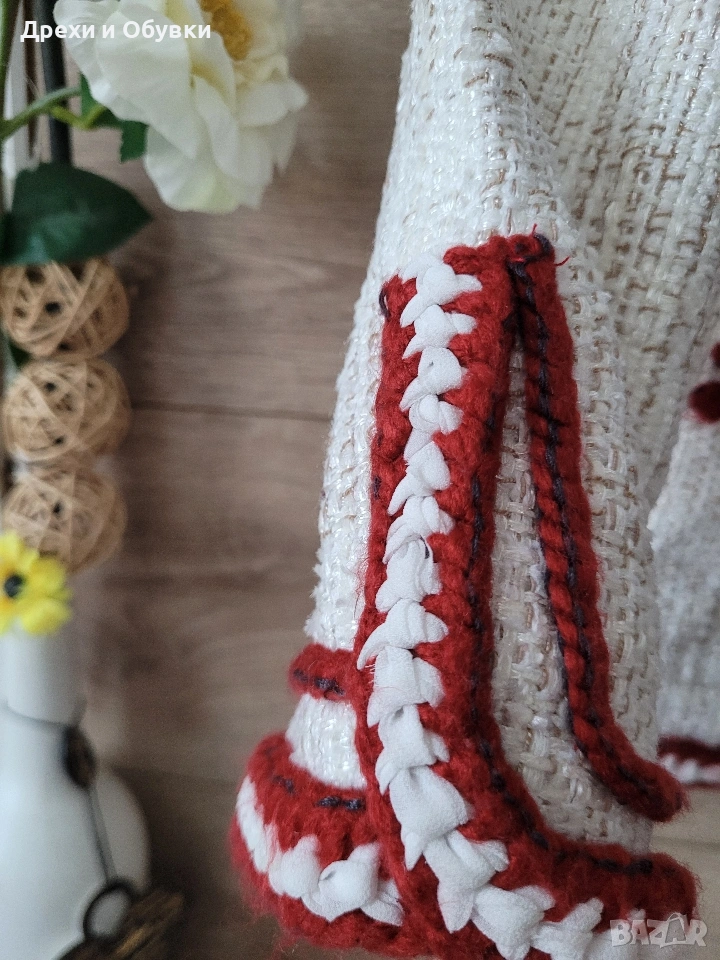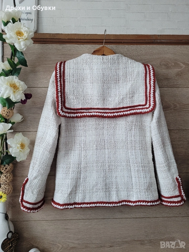 дамско сако в размер M (38) 🤍 FADDANSE PARIS Елегантен модел в с ефектни червени акценти, които придават характер и уникалност. Материята е с интересна текстура, наподобяваща ръчно тъкан плат, а декоративните кантове и детайли създават усещане за бутикова изработка. ✔ Размер: 38 (M) Гръдна 90-94см, дължина 60см ✔ Състояние: отлично ✔ Закопчаване: без копчета (отворен модел) ✔ Детайли: джобове, контрастни кантове, стилна яка . Подходящо както за ежедневна визия, така и за по-елегантни поводи. Лесно се комбинира с дънки, панталон или рокля. Цена 20€