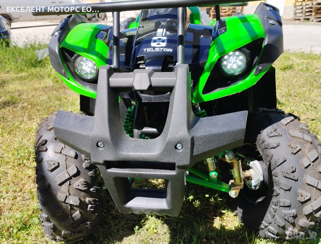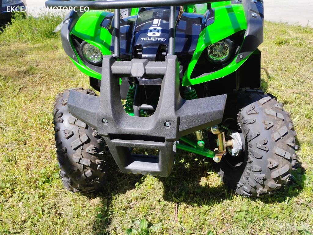 Прекрасно Електрическо ATV TS-1000 NEW GREEN 1500W 12Ah, подходящо за пресечен терен и всякакви условия. Висока мощност - максимална скорост - 35 км/ч, цифров километраж, бързи и бавни скорости + задна скорост. Предни барабанни и задни дискови спирачки. Гуми с висок грайфер. Предни мощни LED фарове със степени, LED габарити стоп. Силен клаксон. Време за зареждане на батерията: от 6 до 8 часа.