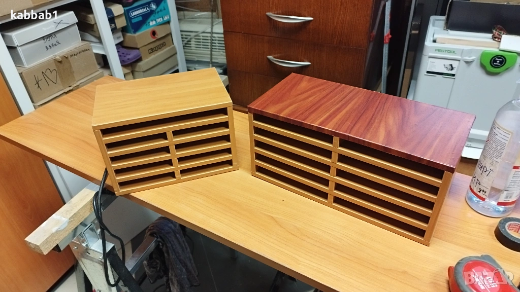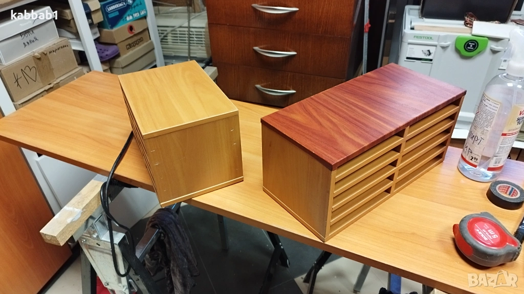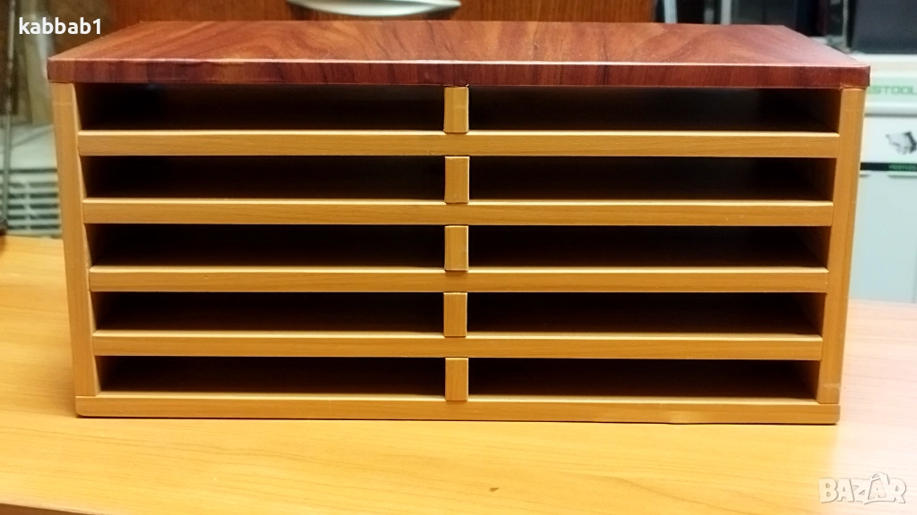 Продавам 2бр органаъзери за документи на бюро , изработени са от ПДЧ имат леки драскотини , но са здрави , големият е с фолирана горна част. Разстоянието между пафтчетата е 2см