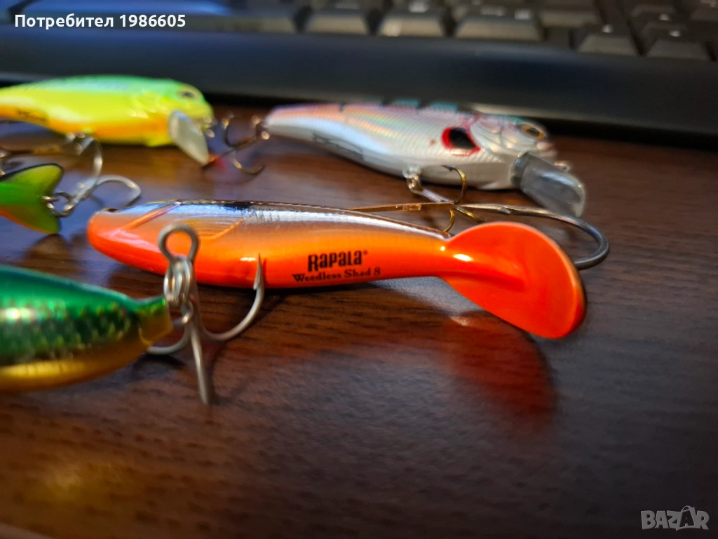 2 броя SPRO Power Catcher Crank 70mm, 1 Rapala WEEDLESS SHAD 8cm, 1 Rapala Minnow 8cm made in Finland (рядък е, понеже е с тройка, а не е weedless), и един, на който не знам марката. Продават се в комплект.
