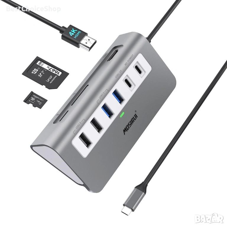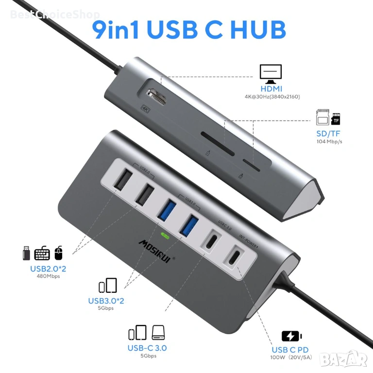 - 9-в-1 USB-C хъб: Докинг станцията Mosirui USB-C разширява един USB-C порт до 9 основни интерфейса: 1×4K@30Hz HDMI, 2×USB 3.0 (5Gbps), 1×USB-C 3.0 (5Gbps), 2×USB 2.0, 1×100W PD 3.0 и двоен четец за SD/TF карти. Като пълноценен USB-C хъб, той е съвместим с MacBook, лаптопи с Windows, iPad Pro и други USB-C устройства, поддържащи видео изход – унифицирано решение.