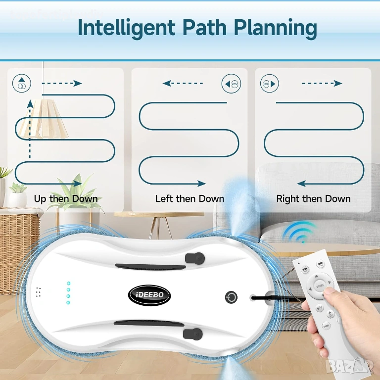 Интелигентно планиране на маршрут и функция за автоматично пръскане - за удобно почистване. Роботът за почистване на прозорци iDEEBO C200 е оборудван с усъвършенствана, интелигентна функция за планиране, която включва дистанционно управление, функция за автоматично пръскане и независимо планиране на маршрут. Той автоматично разпознава краищата на безрамковите прозорци и гарантира, че нито един ъгъл не е пропуснат. Едно натискане на бутон е достатъчно, за да започне почистването - бързо, лесно и без усилие.