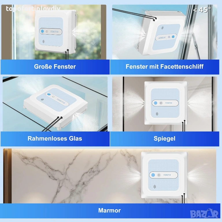 Мощна всмукателна мощност от 6000 Pa: Нашият робот имитира натиска на човек (75 N), за да се залепи сигурно и здраво за всяка повърхност. Ултрасилната всмукателна мощност от 6000 Pa осигурява безопасно почистване на прозорци, огледала или плочки и предотвратява всякакъв риск от падане.