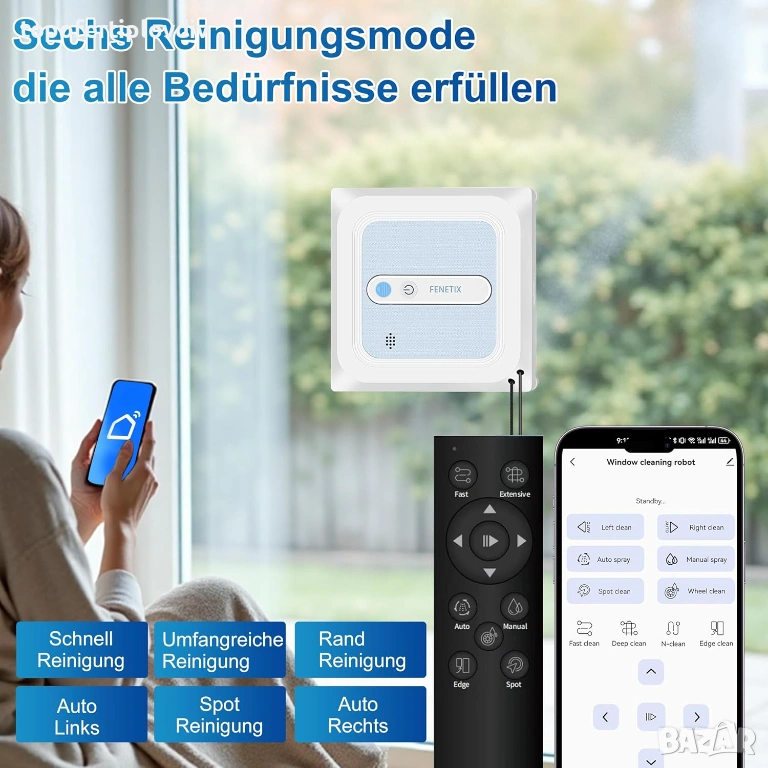 6 интелигентни режима на почистване: С вградено разпознаване на ръбове и интелигентно планиране на пътя, роботът се адаптира към размера на прозореца и автоматично избира най-добрия начин (тип N/Z). Изберете от 6 професионални режима, включително дълбоко почистване и почистване на ръбове, за безупречни резултати.