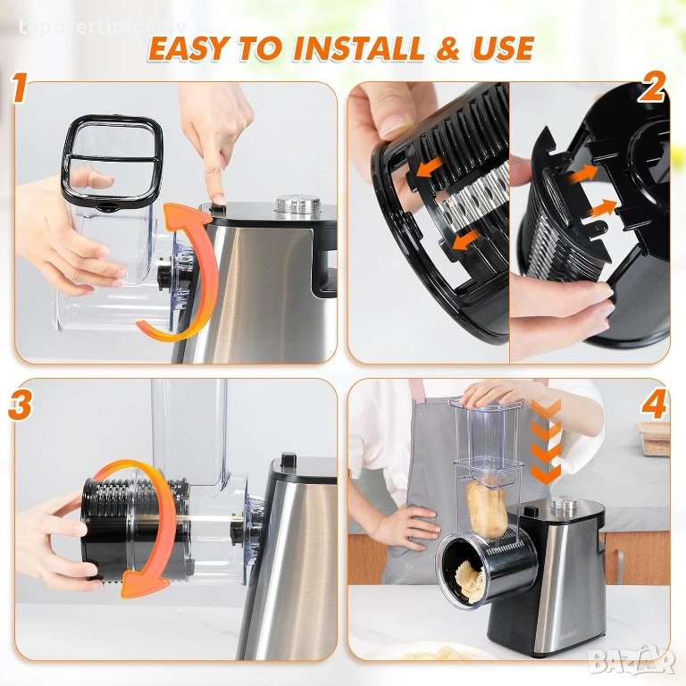 Лесна за употреба: Ротационният превключвател освобождава ръцете ви, като елиминира необходимостта от постоянно натискане на превключвателя. Просто завъртете превключвателя, натиснете храната надолу с буталото и оставете резачката за зеленчуци да си свърши работата.