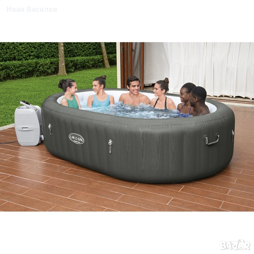 Надуваемо хидромасажно джакузи Bullet Points Bestway Lay-Z-Spa Mauritius Smart AirJet 5-7 души - Размер: 2,70 m x 1,80 m x 71 cm (8 фута 11 инча x 71 инча x 28 инча) - Перфектен размер за до 7 възрастни - Съвместим с приложението Bestway Smart Hub™, което ви позволява да контролирате температурата, таймера, филтъра и системата за масаж от дланта на ръката си - Лесно достъпен цифров контролен панел загрява водата до 40˚C (104˚F) - AirJets изпускат топъл въздух във водата, заобикаляйки ви с успокояващ балонен масаж - Вътрешните греди от плат MaxHold™ осигуряват превъзходно задържане на въздушното налягане, стабилност и лека преносимост - Функцията за автоматично нагряване Freeze Shield™ предпазва помпата и обшивката от повреда поради студено време - Таймерът за пестене на енергия ви позволява да контролирате температурата на вашия СПА център до 40 дни предварително - Подсиленото покритие задържа топлината, когато СПА центърът не се използва - Интегрирана система за филтриране на водата - Дозаторът ChemConnect™ разпръсква равномерно стабилно ниво на хлор - Спа помпата включва поставки за чаши за удобно съхранение - Воден капацитет (80%): 1370 L (362 гал.) - Съдържание: 1 спа център, 1 капак, 1 спа помпа, 1 филтърна касета (VI), 1 дозатор ChemConnect™, 1 ремонтна лепенка Bestway Lay-Z-Spa Mauritius Smart AirJet надуваема спа вана с хидромасажна вана 5-7 души: След дълъг ден няма нищо по-релаксиращо от това да се потопите в топла, бълбукаща вода точно в собствения ви двор. Lay-Z-Spa Mauritius Smart AirJet™ осигурява успокояващо масажно изживяване за до 7 души, като същевременно се настройва бързо и лесно. Този СПА център достига до 40ªC (104ªF), за да осигури върховна релаксация, докато сте заобиколени от 180 AirJet масажни мехурчета. Просто прикрепете помпата и наблюдавайте как се надува. Контрол на една ръка разстояние: Този спа център може да се управлява от вашето смарт устройство чрез приложението Bestway Smart Hub™. Тази иновация прави Мавриций един от най-удобните спа центрове на пазара. Приложението ви позволява да настроите вашия СПА център на перфектната температура, да активирате таймера за пестене на енергия, да пуснете водния филтър и да контролирате системата за масаж - всичко това от дланта на ръката ви, където и да сте. Система за успокояващ масаж: Системата AirJet включва 180 дюзи, които изпускат мехурчета от дъното на спа центъра, за да създадат топла, бълбукаща среда в гореща вана. Тези успокояващи мехурчета ще ви помогнат да се отпуснете и да си починете направо от комфорта на вашия дом. Създадена да осигури максимален комфорт и релаксиращо изживяване, тази система за масаж разполага с две нива на интензивност, така че вашето време за релаксация е напълно персонализирано. Издръжлива конструкция: вътрешните греди от плат MaxHold™ осигуряват превъзходно задържане на въздушното налягане, стабилност и лека преносимост. Тази конструкция предлага изключителна устойчивост на разтягане, позволявайки на спа центъра да поддържа предвидената си форма с течение на времето, без значение колко пъти го надувате и изпускате. Заобиколен от 3-слоен външен слой DuraPlus™, този спа е доказано устойчив на пробиване и повреди. Иновативна технология за зимуване: Включената функция за автоматично нагряване Freeze Shield™ предотвратява замръзване на вътрешните компоненти при по-ниски температури. Проектирана с иновативна технология за зимуване, системата ще поддържа вътрешните температури между