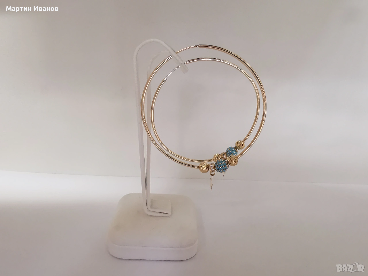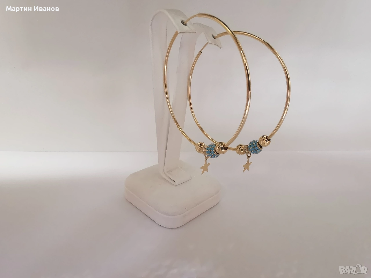 Златни обеци халки тип пандора,със сини камъни,14к,585пр,6.17гр,вътрешен диаметър 5см