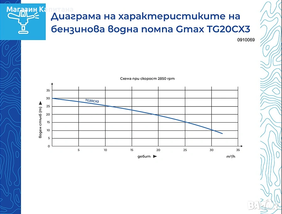 Бензинова помпа за вода GMAX TG20CX3 е с максимален смукателен порт 8 м, размер 2" и максимален дебит 32 м³/ч. Притежава фабрично монтиран карбуратор към който може да се свърже газова бутилка и да работи на газ. Използва се за изпомпване на чиста вода без абразивни в селското стопанство и промишлеността за захранване на капкови системи или пренос на вода от водоизточника до резервоара. Помпата може да работи на разстояние не по-голямо от 4.5 метра, между седмия и осмия метър засмукват вода и въдух.