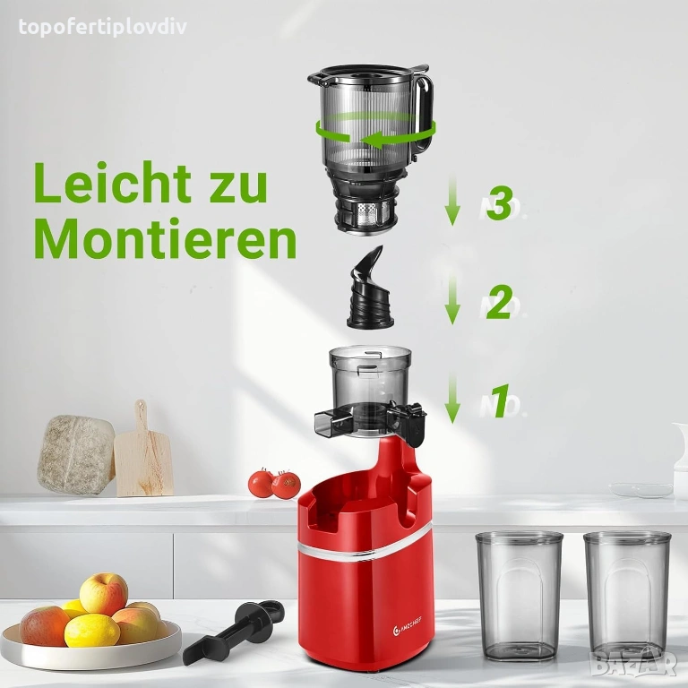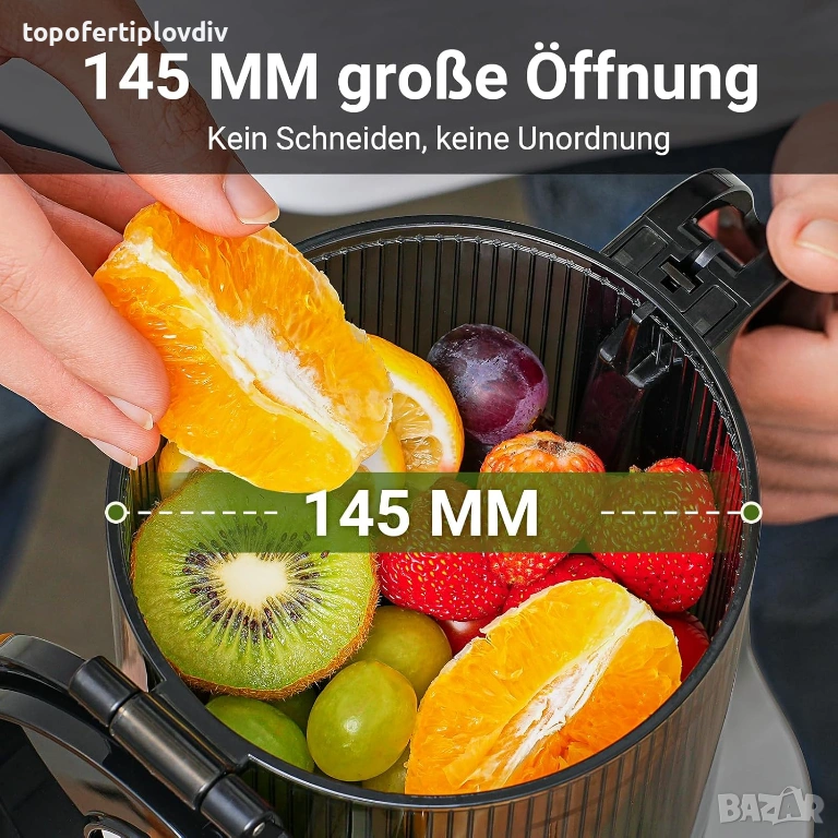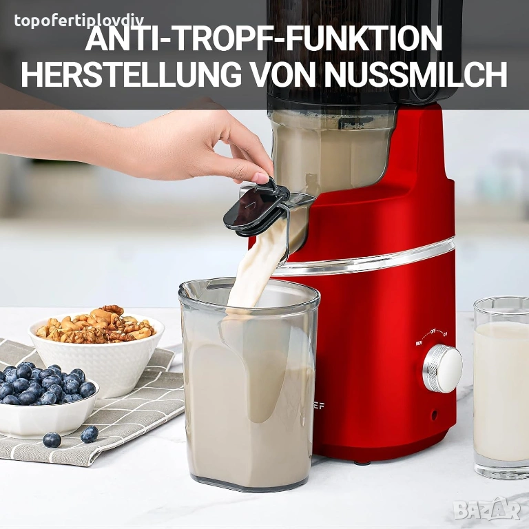 Автоматична сокоизстисквачка: новото поколение на сокоизстисквачката AMZCHEF е различна от традиционните сокоизстисквачки. Отворът от 145 мм и капацитетът от 1,8 литра ви освобождават от досадната задача да пълните бавната сокоизстисквачка със съставки отново и отново. Насладете се на оригинални сокове просто, по-лесно и по-лесно. !