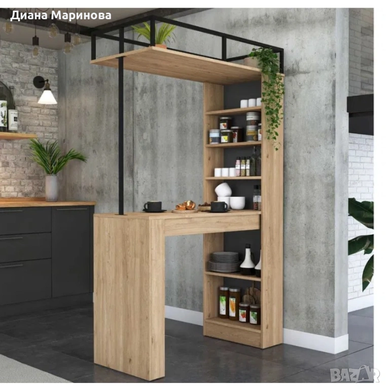 Практична и функционална бармаса с етажерка за съхранение. Дължина 1.20 см, височина 2 м. Ширина 56 см. Продава се сглобена. Състояние ново.